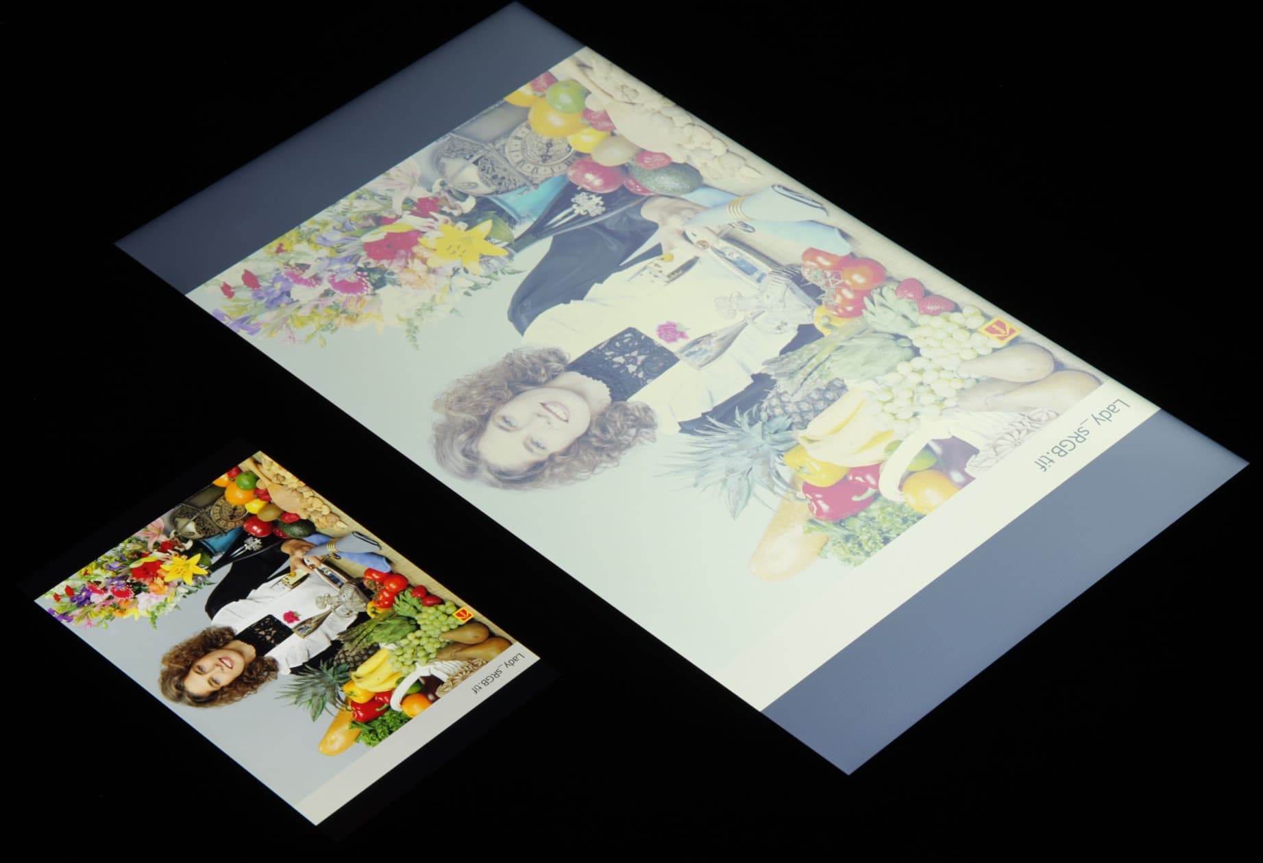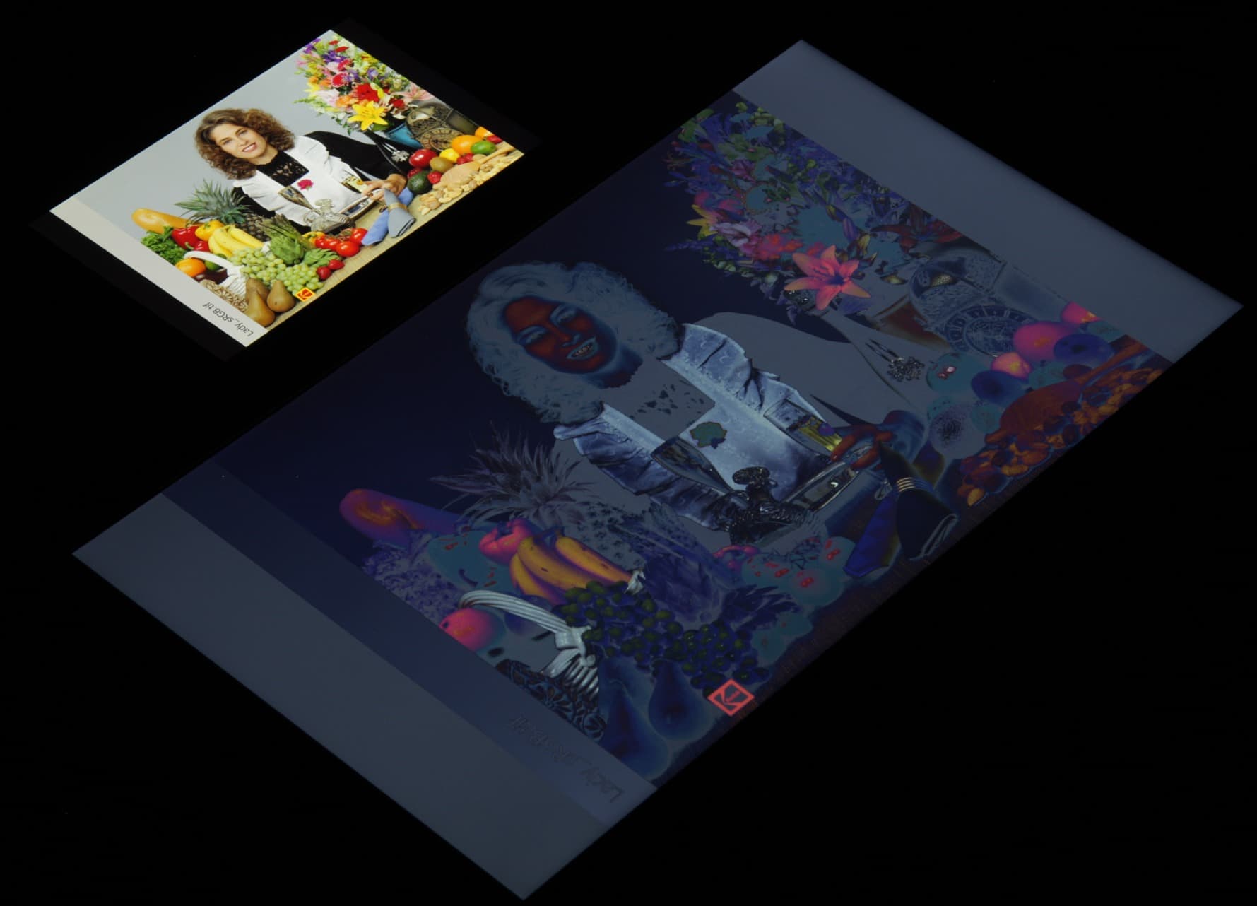 Экран имеет очень плохие углы обзора. При отклонении по горизонтали картинка еще не очень сильно искажается, но при незначительном отклонении вниз сильно инвертируются темные оттенки, а при отклонении вверх — инвертируются светлые. Фотографии ниже, сделанные под углом примерно 45 градусов к плоскости и к стороне экрана, это демонстрируют (для сравнения используется планшет Google Nexus 7 (2013)):