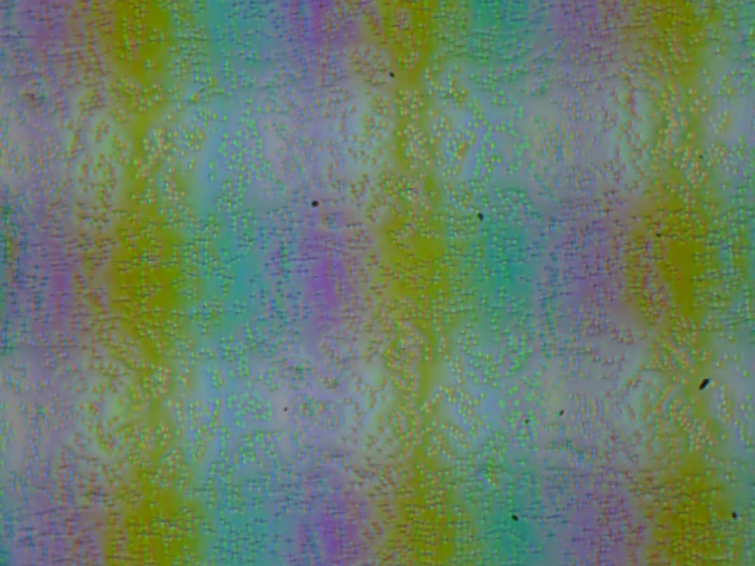 Зерно этих дефектов в несколько раз меньше размеров субпикселей (масштаб этих двух фотографий примерно одинаковый), поэтому фокусировка на микродефектах и «перескок» фокуса по субпикселям при изменении угла зрения выражены слабо, из-за этого нет и «кристаллического» эффекта.