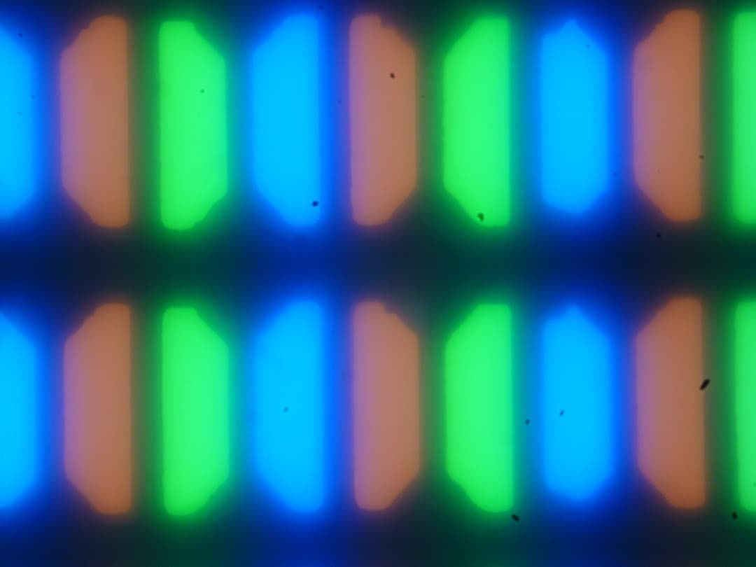В этом ноутбуке используется матрица типа TN. Микрофотографии демонстрируют типичное для TN отсутствие тонкой структуры субпикселей (черные точки — это пыль на матрице фотоаппарата):