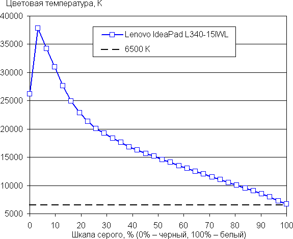 TN-экран — это, конечно, штука специфическая. Давно находящиеся в окружении лучших IPS- и OLED-экранов авторы (а на тесты производители всегда стремятся предложить модели получше) позволили себе роскошь забыть о подобных решениях. Насколько все плохо? Ну, вопросы цветового охвата и точности цветопередачи даже поднимать не будем — ясно, что ноутбуки вроде Lenovo IdeaPad L340-15IWL приобретают не для профессиональной работы. Но TN-экран неудобен и в быту: чуть откинешься по-иному в кресле — выцвели или инвертировались края; подойдешь взглянуть на экран сбоку — не видишь привычной четкой картинки, приходится выгибать голову или разворачивать ноутбук к себе. Какая уж там работа под ярким солнцем — тут в комнате бы получить красивое читаемое изображение! Конечно, работать за таким экраном можно, хотя очень желательно использовать интерфейс с белым фоном, потому что черный выцветает просто немилосердно. Но это объективно самое слабое место ноутбука. Ну а аппаратные тесты — их никто не отменял.