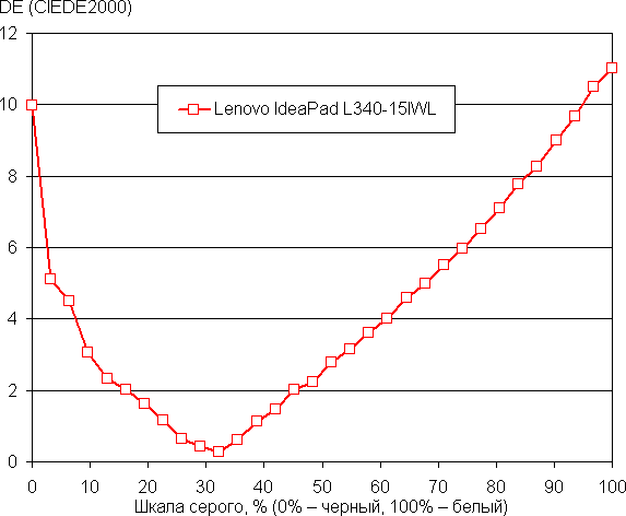 Баланс оттенков на шкале серого очень плохой, так как цветовая температура на большей части шкалы выше стандартных 6500 К, и отклонение от спектра абсолютно черного тела (ΔE) на белом поле выше 10, что даже для потребительского устройства считается плохим показателем. При этом цветовая температура и ΔE очень сильно изменяются от оттенка к оттенку — это отрицательно сказывается на визуальной оценке цветового баланса. (Самые темные области шкалы серого можно не учитывать, так как там баланс цветов не имеет большого значения, да и погрешность измерений цветовых характеристик на низкой яркости большая.)
