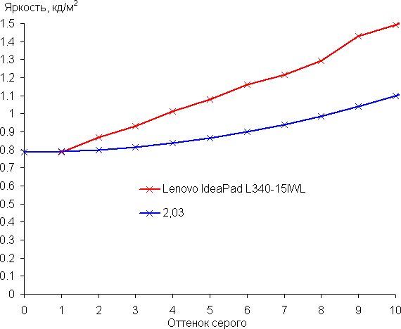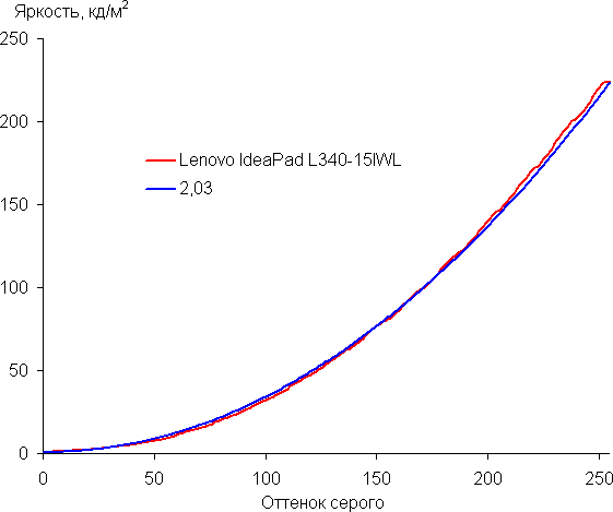 Аппроксимация полученной для настроек по умолчанию гамма-кривой дала показатель 2,03, что ниже стандартного значения 2,2. При этом реальная гамма-кривая заметно отклоняется от аппроксимирующей степенной функции:
