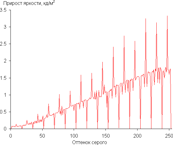 Далее мы измерили яркость 256 оттенков серого (от 0, 0, 0 до 255, 255, 255) при настройках по умолчанию. График ниже показывает прирост (не абсолютное значение!) яркости между соседними полутонами: