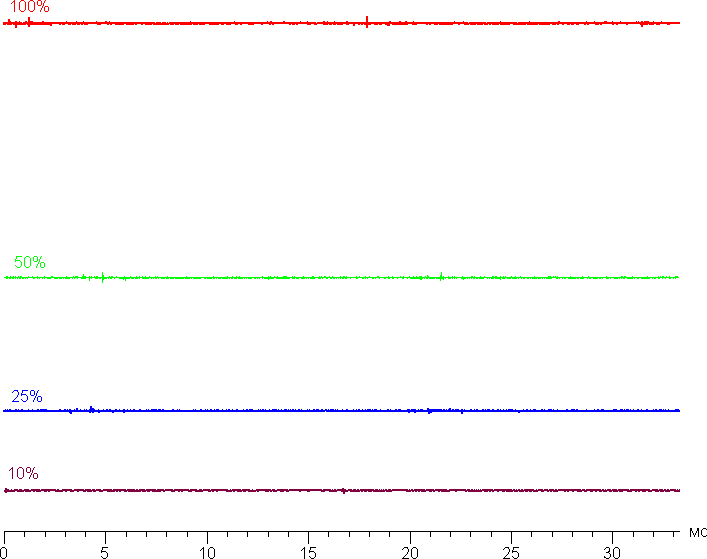 На любом уровне яркости значимая модуляция подсветки отсутствует, поэтому нет и никакого мерцания экрана. В доказательство приведем графики зависимости яркости (вертикальная ось) от времени (горизонтальная ось) при различных значениях настройки яркости:
