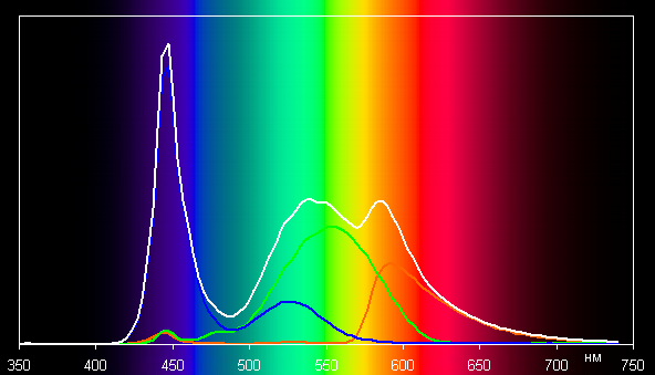 Ниже приведен спектр для белого поля (белая линия), наложенный на спектры красного, зеленого и синего полей (линии соответствующих цветов):