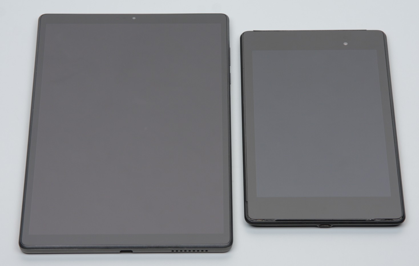 Лицевая поверхность экрана выполнена в виде стеклянной пластины с зеркально-гладкой поверхностью, устойчивой к появлению царапин. Судя по отражению объектов, антибликовые свойства экрана чуть лучше, чем у экрана Google Nexus 7 (2013) (далее просто Nexus 7). Для наглядности приведем фотографию, на которой в выключенных экранах отражается белая поверхность (слева — Lenovo Tab M10 HD, справа — Nexus 7, далее их можно различать по размеру):