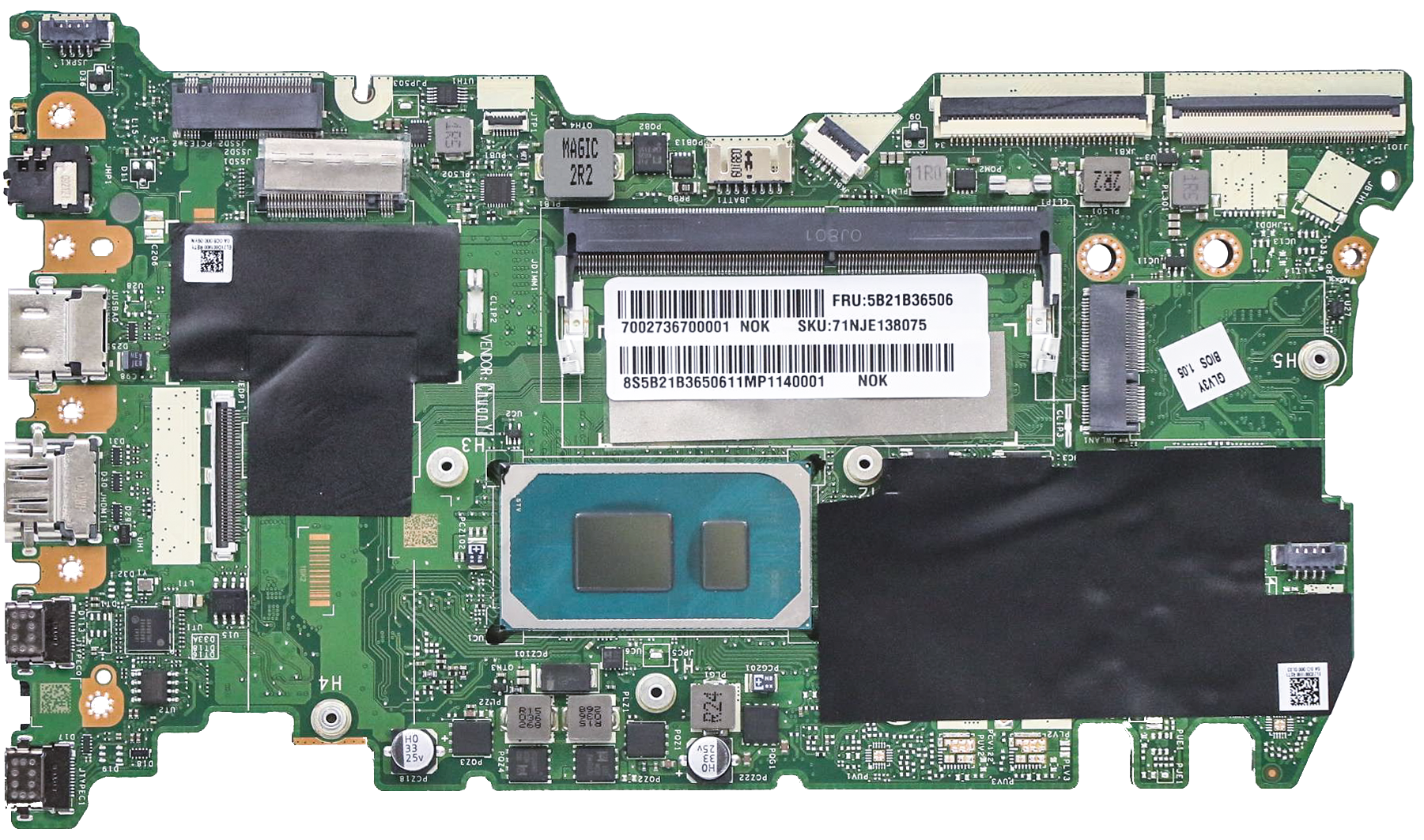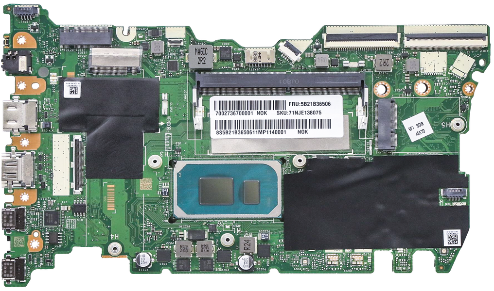 Системная плата относительно невелика по размерам. Здесь наиболее узнаваемы слот для модуля SO-DIMM и центральный процессор. Под черными изолирующими накладками слева от последнего расположена распаянная на плате память, а справа — схемотехника питания и управления. Рассмотрим анатомические особенности с фокусом на апгрейд и замену комплектующих.