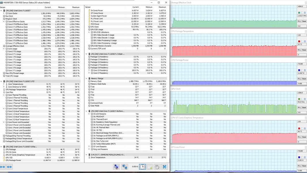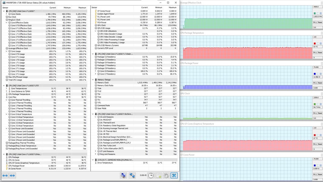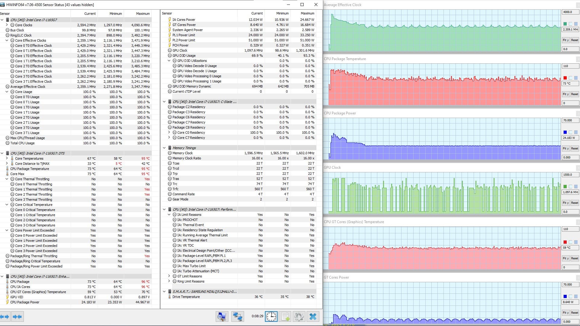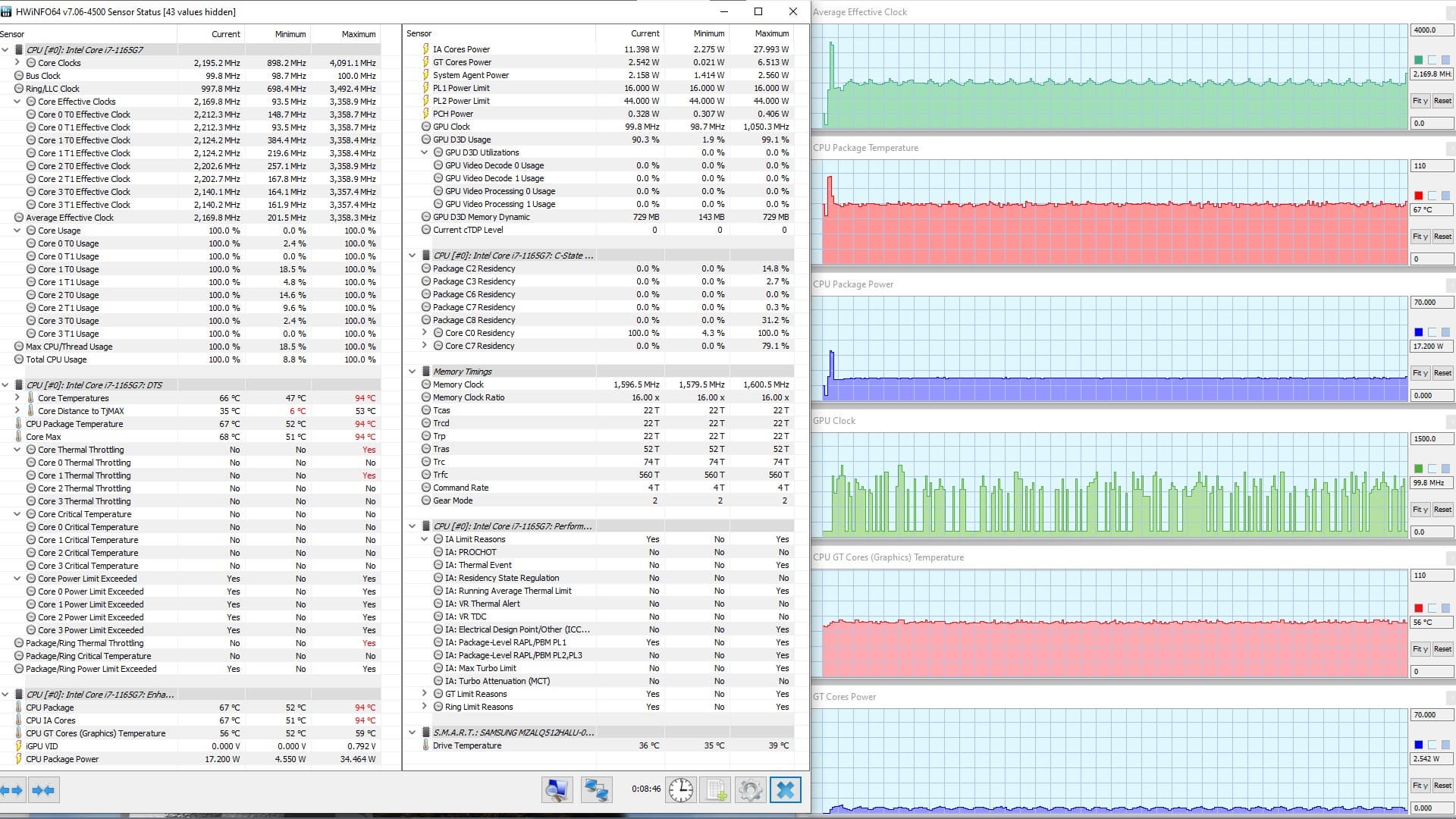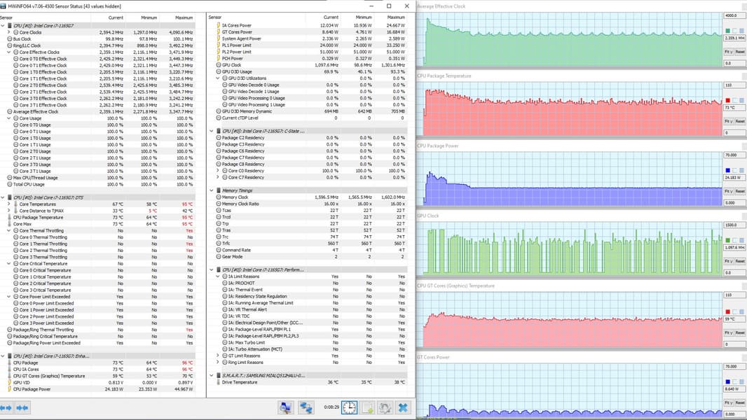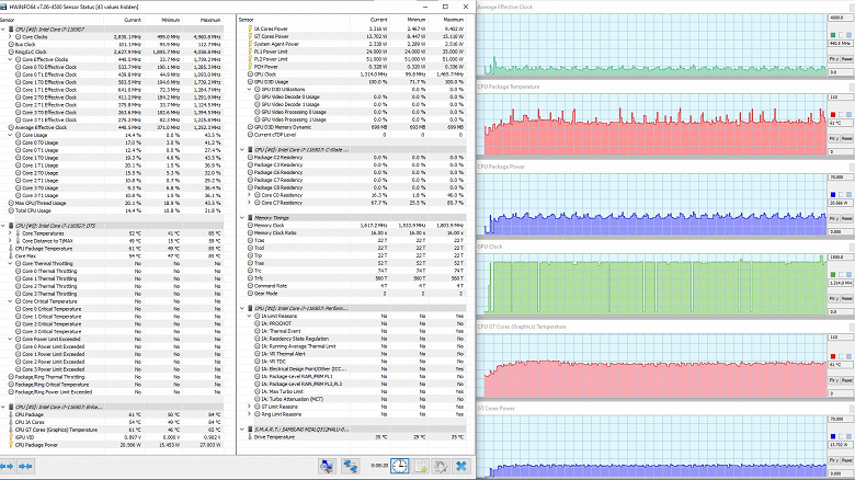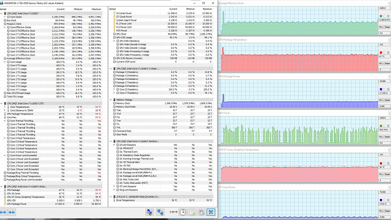 В режиме «всё на максимум» первоначальные броски заметны на всех графиках, и все они характеризуются долгим (около 1,5 мин.) и плавным последующим понижением каждого параметра до стабилизированных значений. Но в коротком начальном периоде CPU успевает дойти до перегрева и тротлинга (у двух ядер). При относительно невысоком среднем потреблении 8,6 Вт кривая изменений тактовой частоты GPU рисует гребенку, варьируя в диапазоне 100—1300 МГц. Вновь создается впечатление, что центральный процессор не дает графике развернуться.