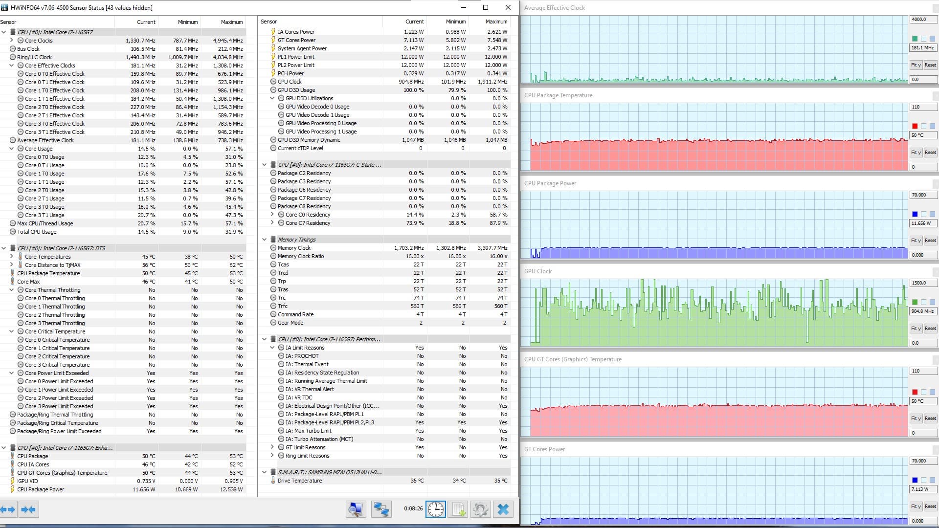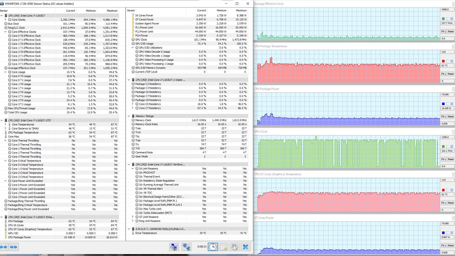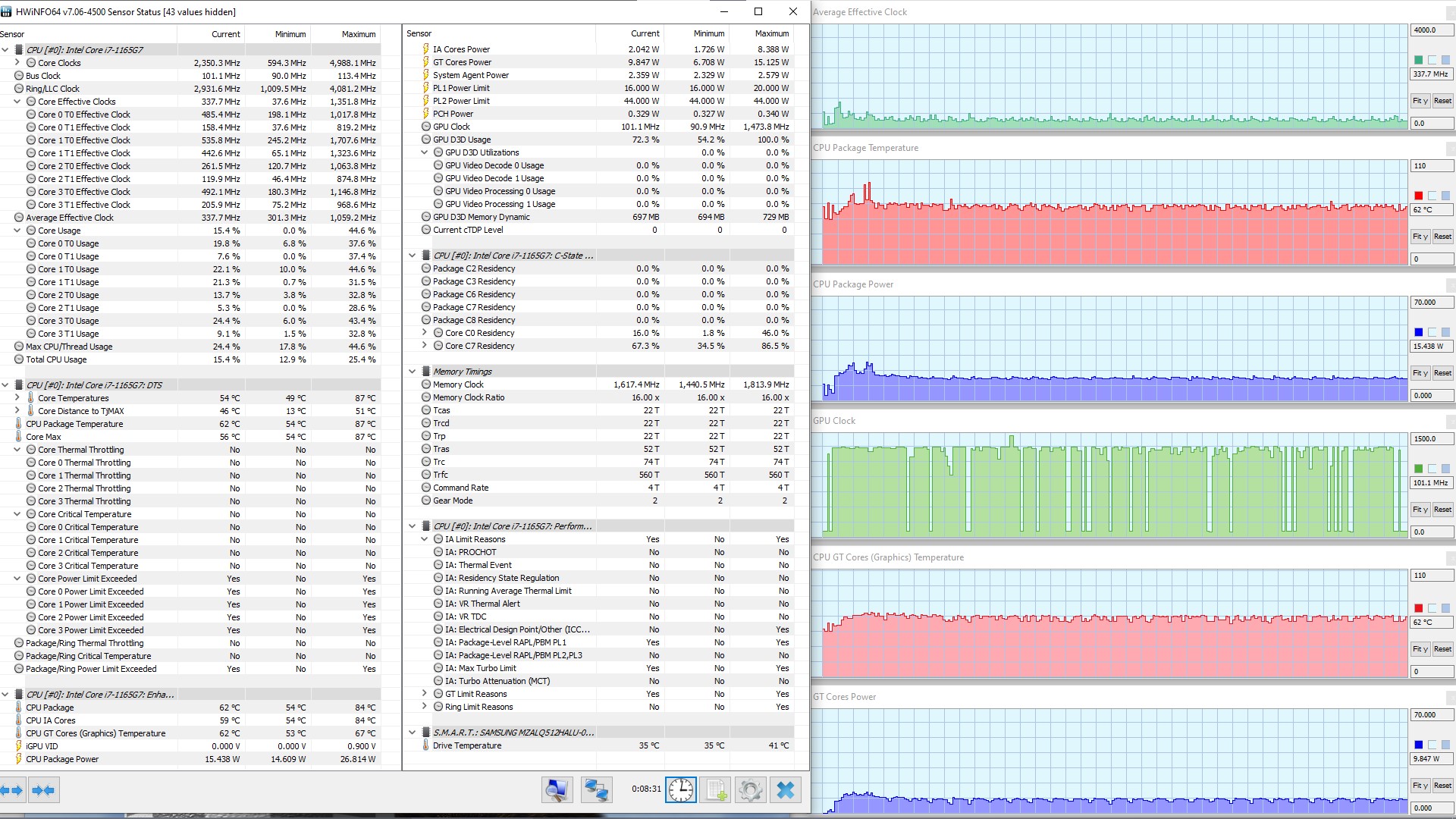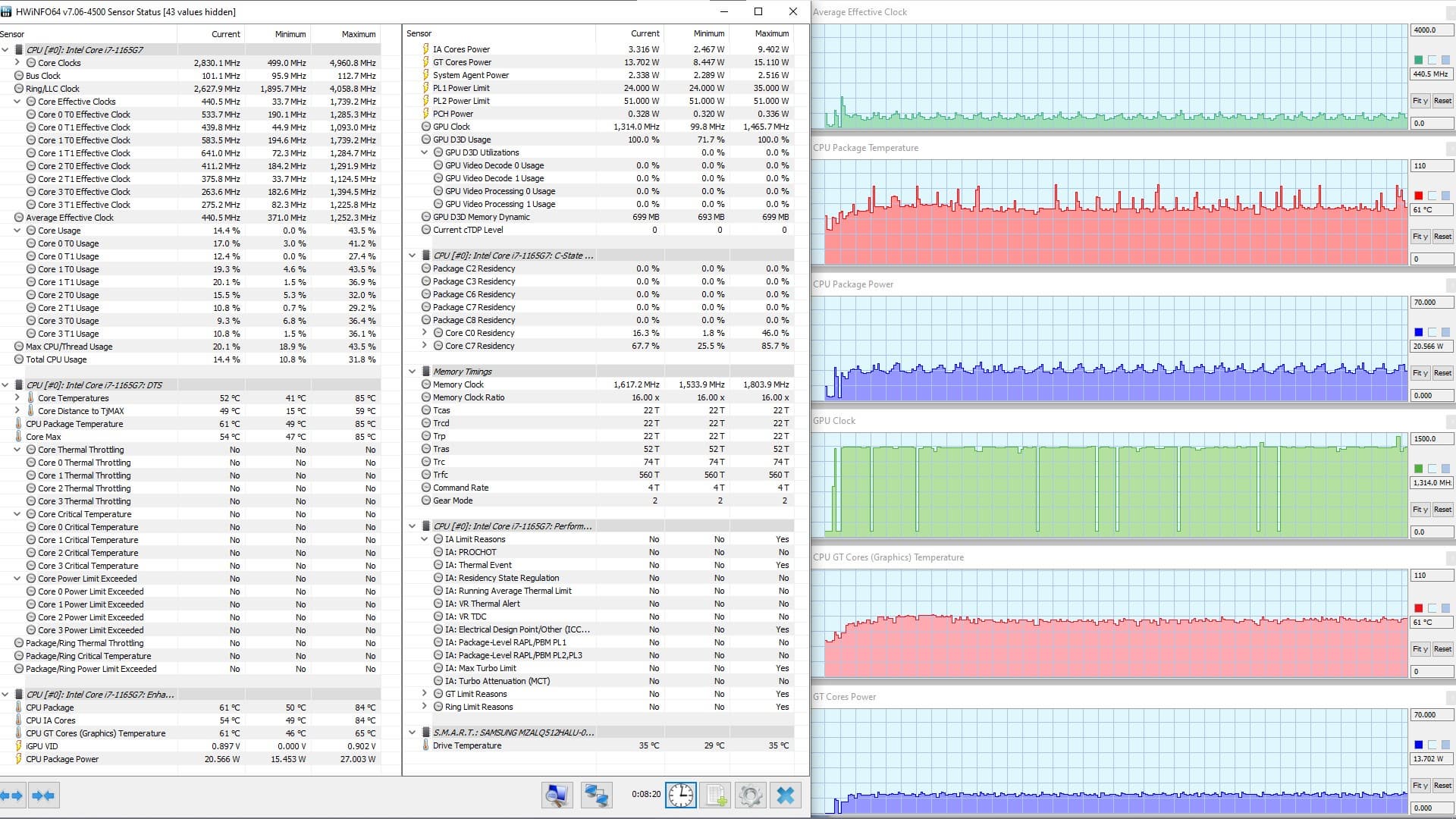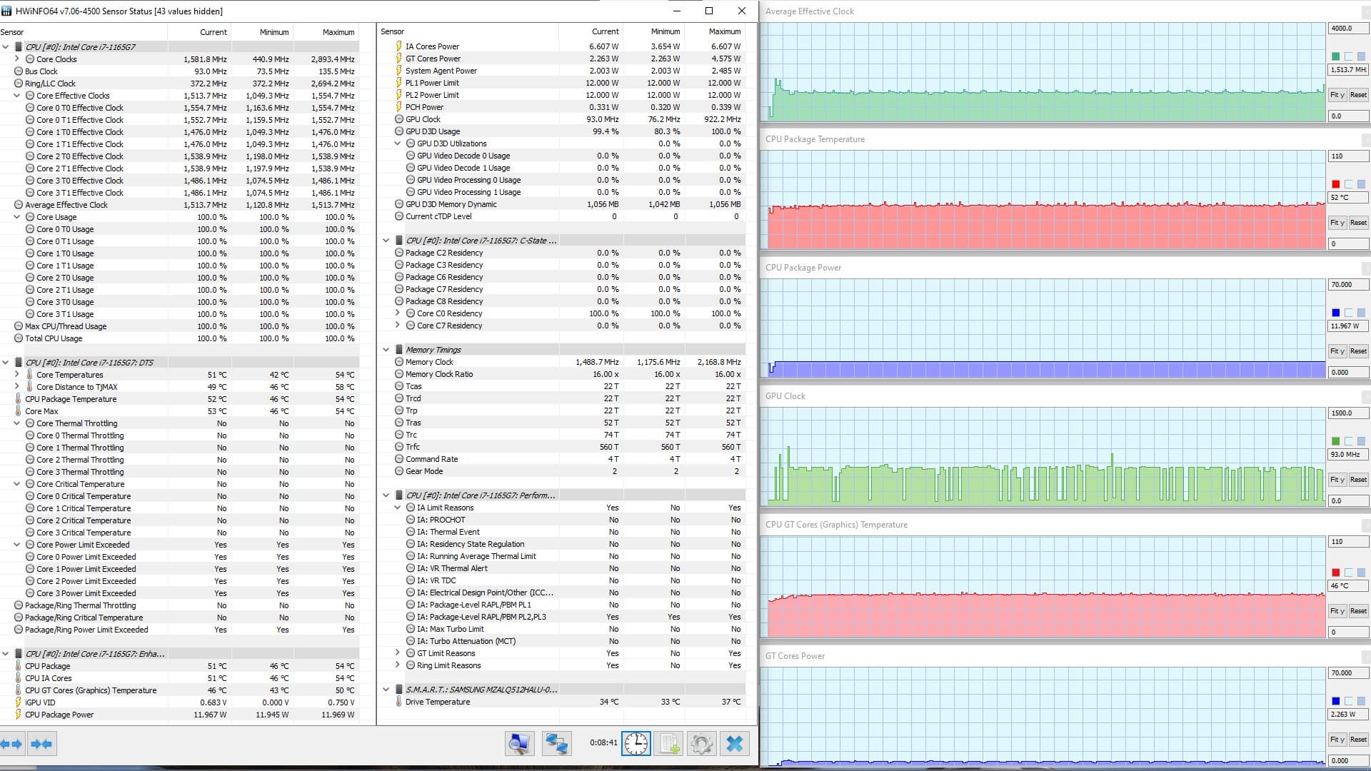 В режиме «всё на максимум» первоначальные броски заметны на всех графиках, и все они характеризуются долгим (около 1,5 мин.) и плавным последующим понижением каждого параметра до стабилизированных значений. Но в коротком начальном периоде CPU успевает дойти до перегрева и тротлинга (у двух ядер). При относительно невысоком среднем потреблении 8,6 Вт кривая изменений тактовой частоты GPU рисует гребенку, варьируя в диапазоне 100—1300 МГц. Вновь создается впечатление, что центральный процессор не дает графике развернуться.