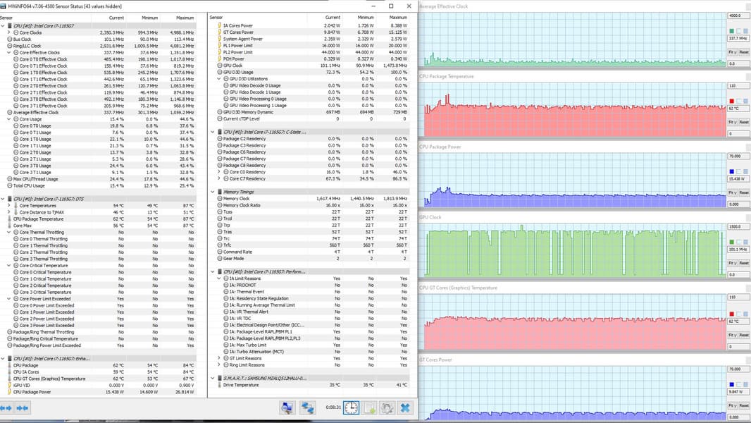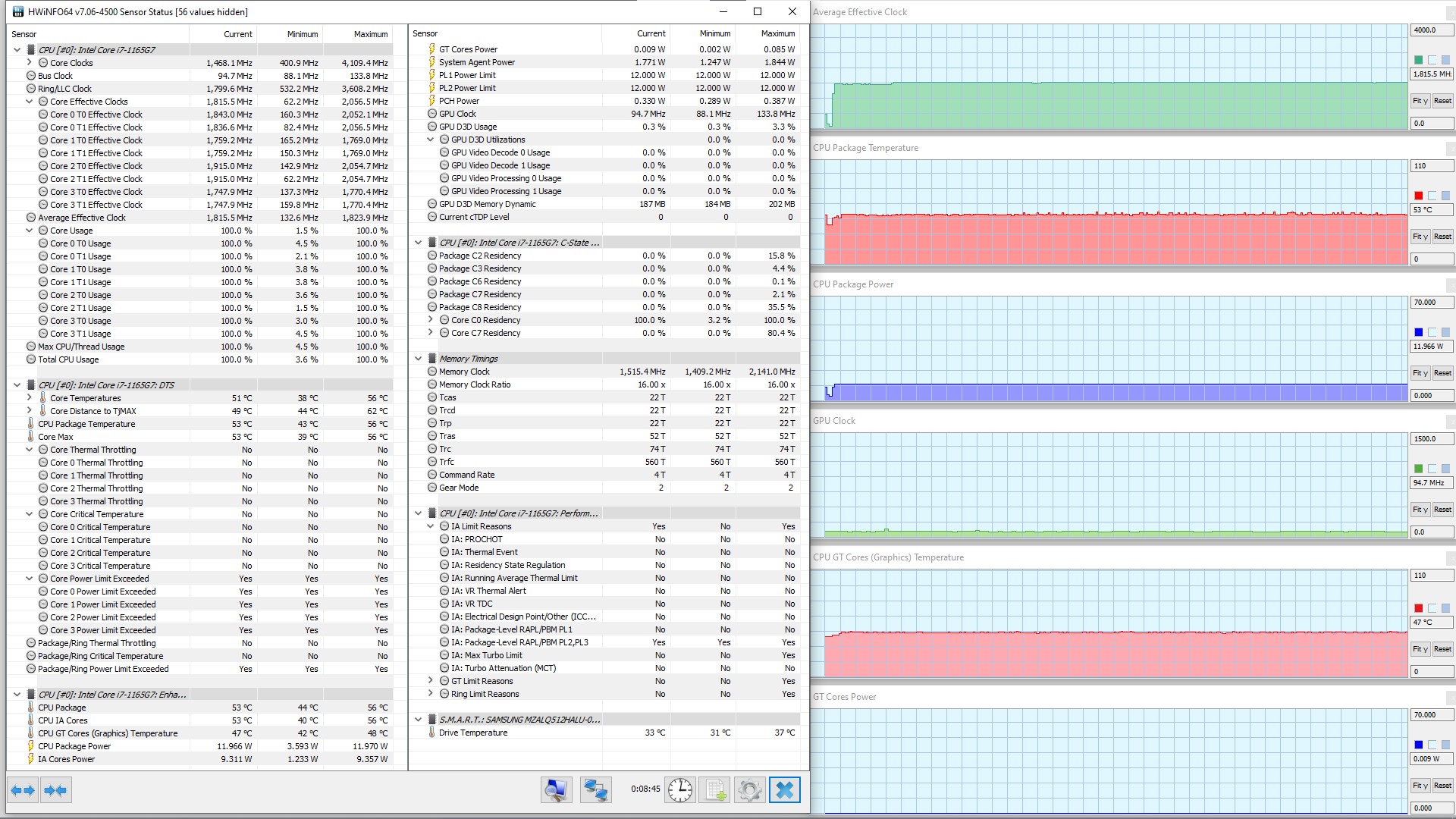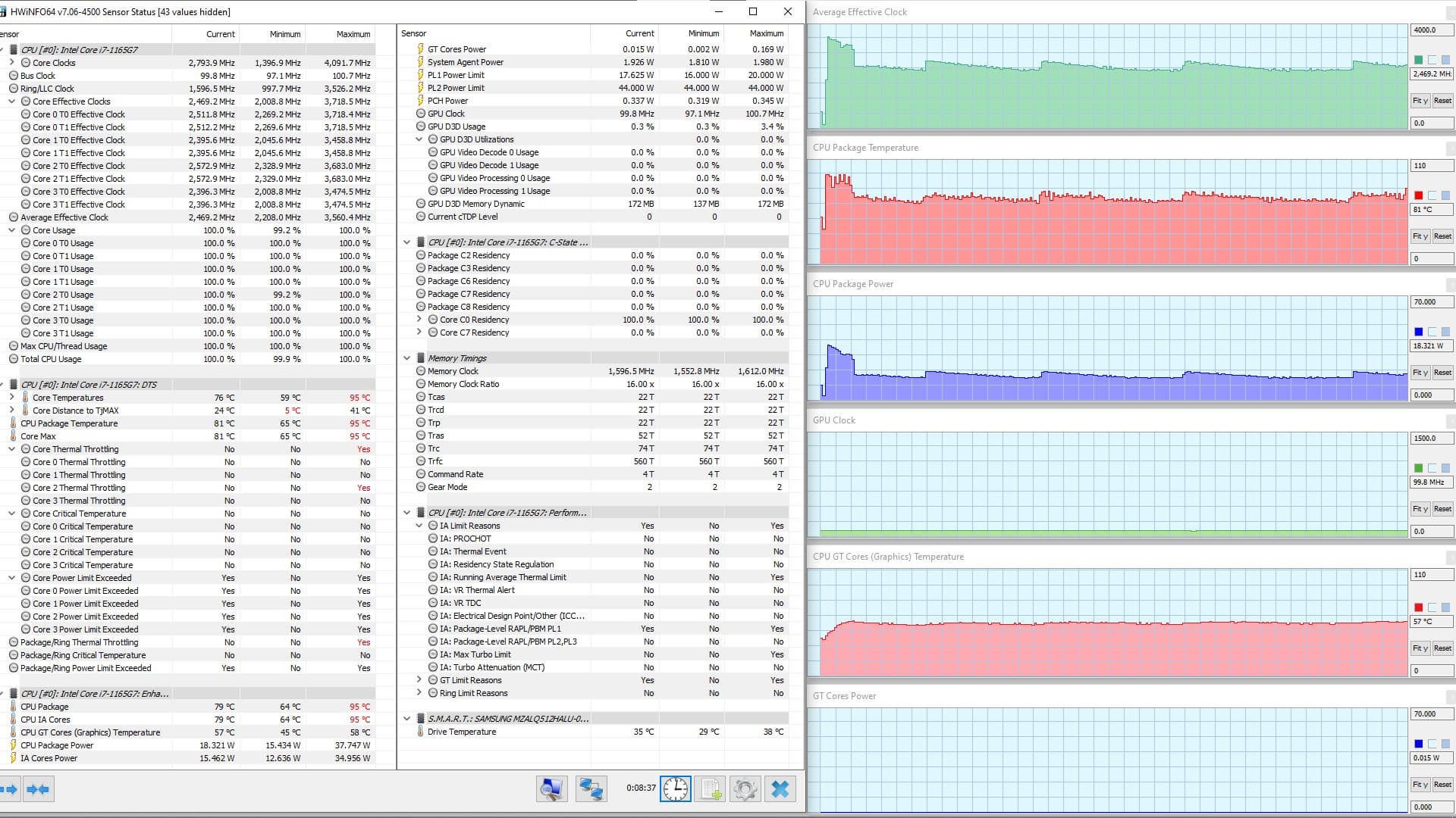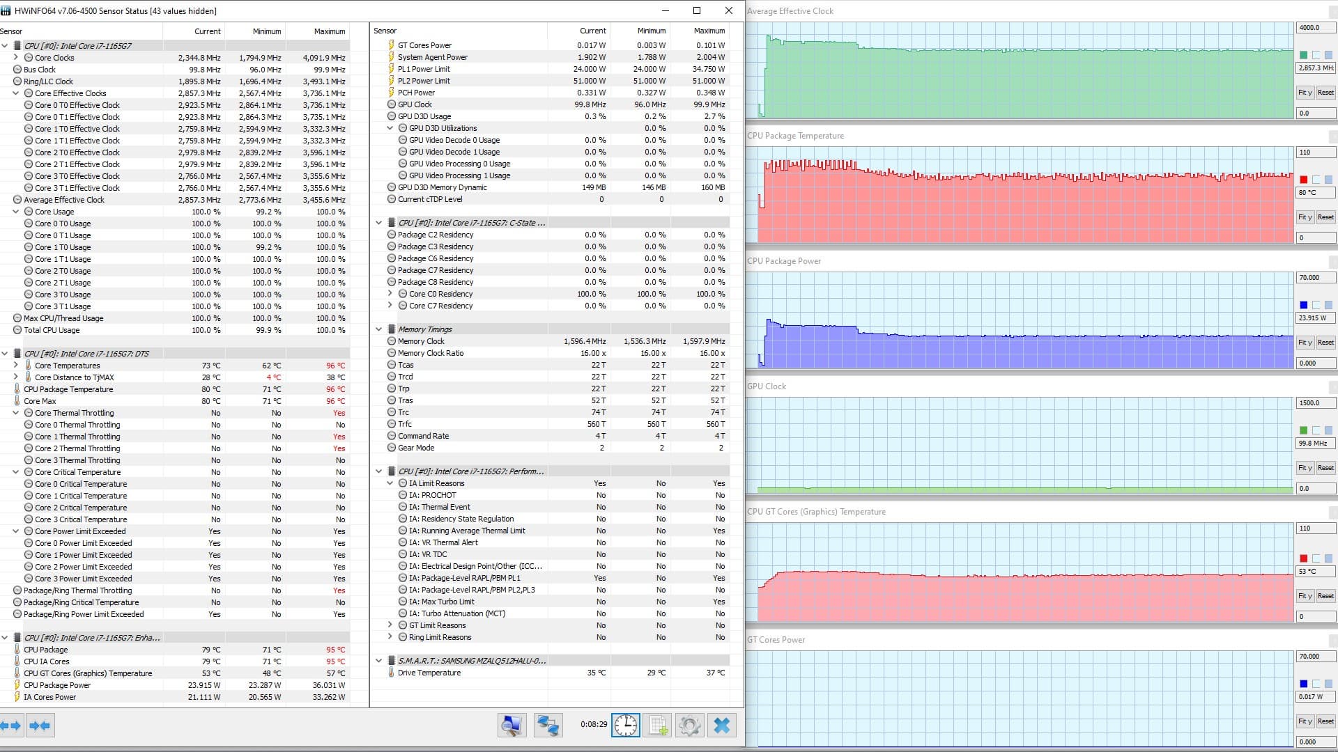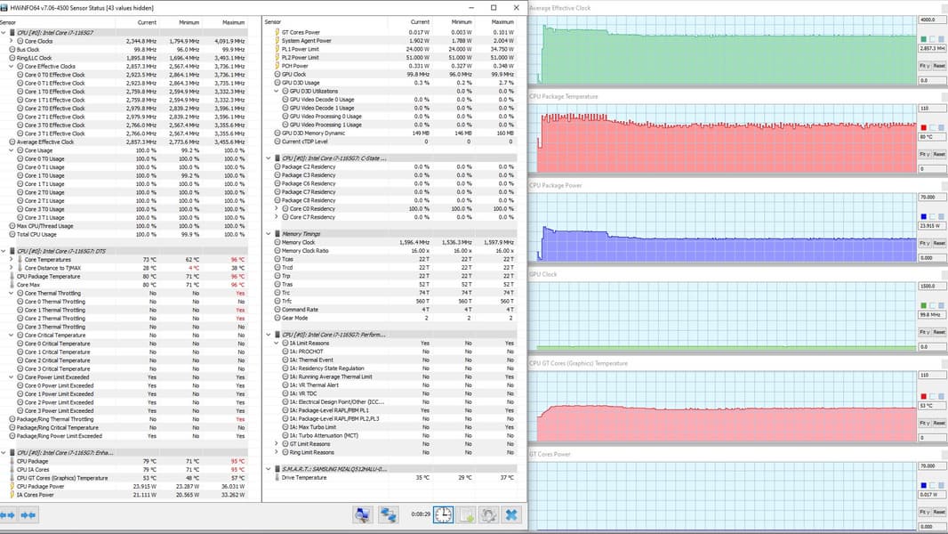 В режиме «всё на максимум» первоначальные броски заметны на всех графиках, и все они характеризуются долгим (около 1,5 мин.) и плавным последующим понижением каждого параметра до стабилизированных значений. Но в коротком начальном периоде CPU успевает дойти до перегрева и тротлинга (у двух ядер). При относительно невысоком среднем потреблении 8,6 Вт кривая изменений тактовой частоты GPU рисует гребенку, варьируя в диапазоне 100—1300 МГц. Вновь создается впечатление, что центральный процессор не дает графике развернуться.