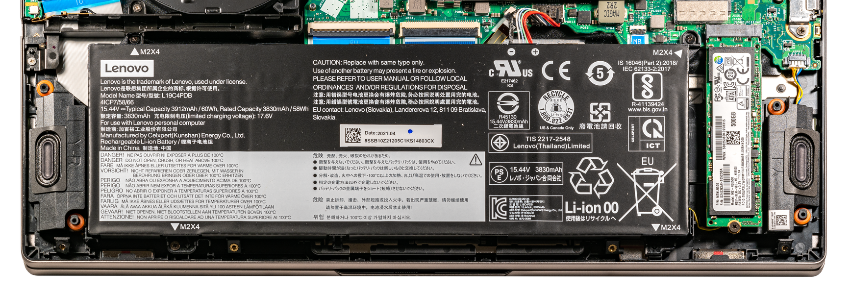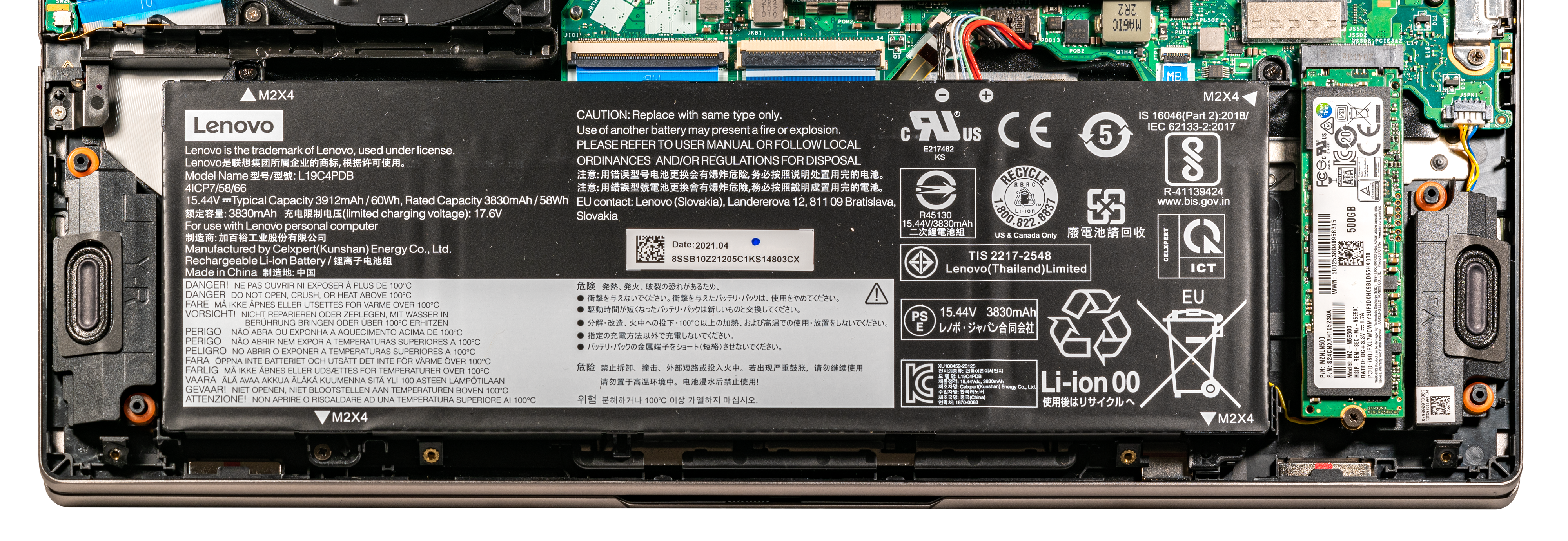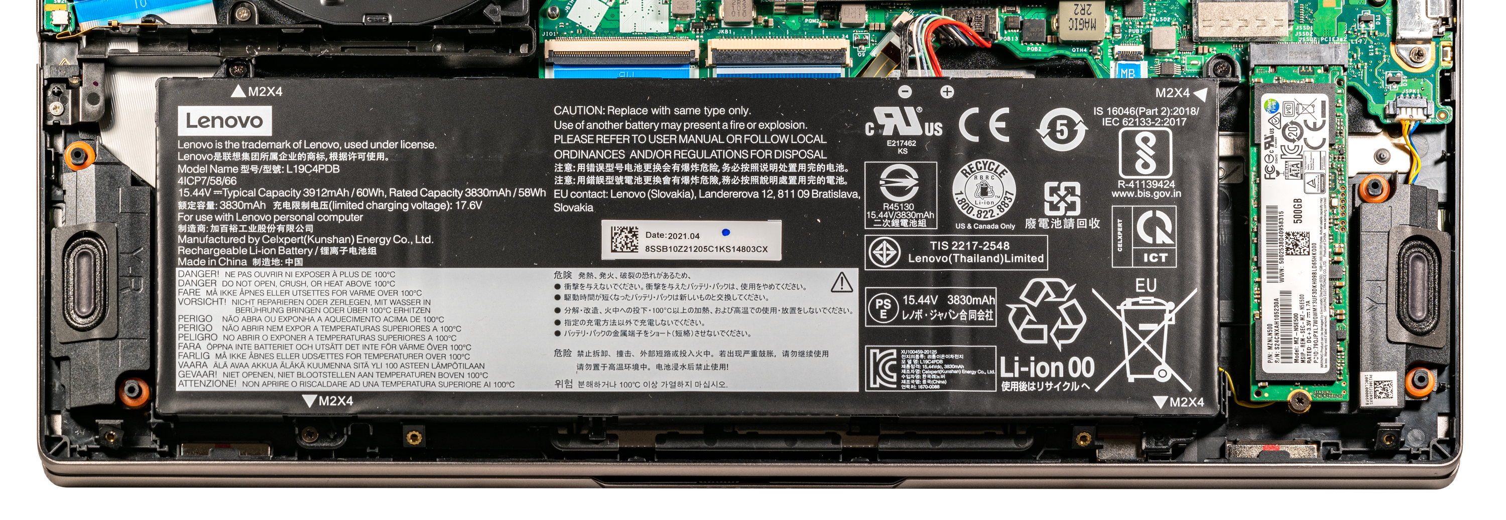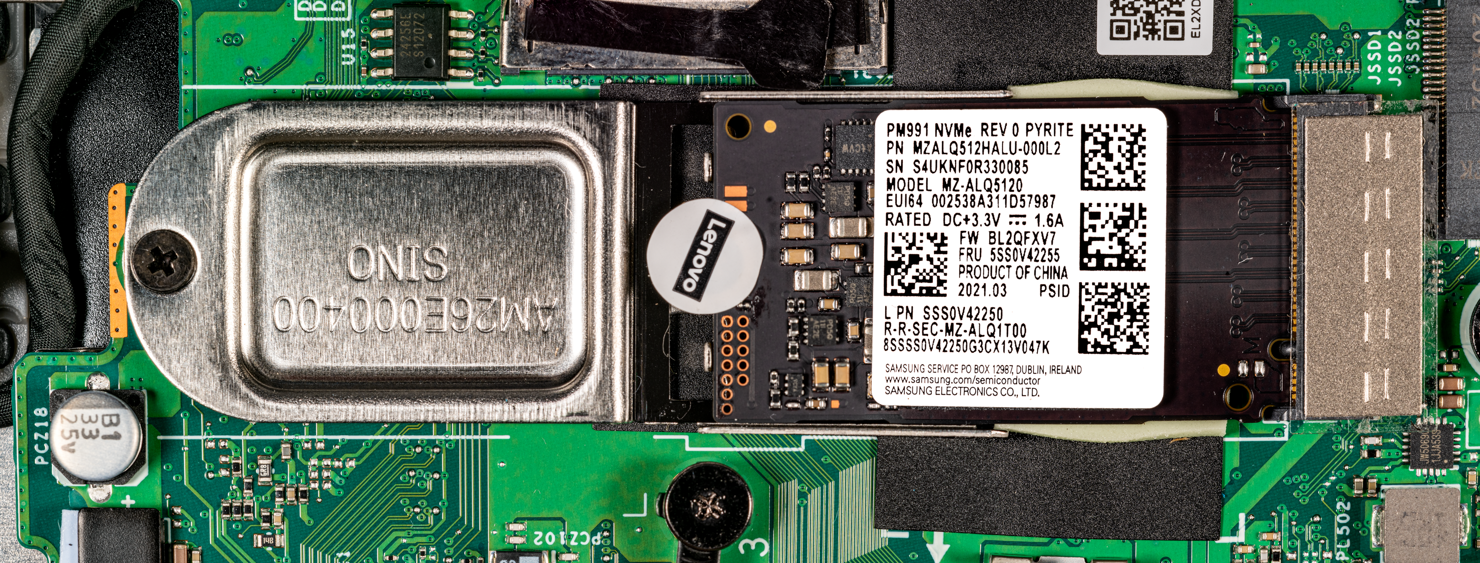 Слева от перевернутого вверх дном правого динамика на системной плате имеется свободный слот для второго SSD-накопителя с интерфейсом PCIe 3.0, который можно использовать для апгрейда.