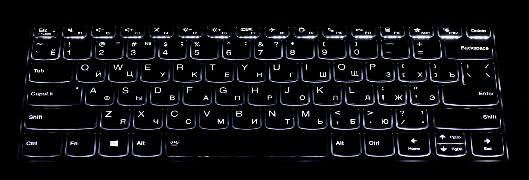 Клавиатура снабжена подсветкой с двухуровневой регулировкой по яркости (третье состояние — подсветка выключена), циклическое переключение производится аккордом Fn+пробел. Все буквы латиницы и кириллицы, цифры, знаки и спецсимволы подсвечиваются одинаково ярко. То же и в других национальных версиях с «арабицей», «японицей» и т. д. Работать с текстом легко и удобно даже при нехватке света.