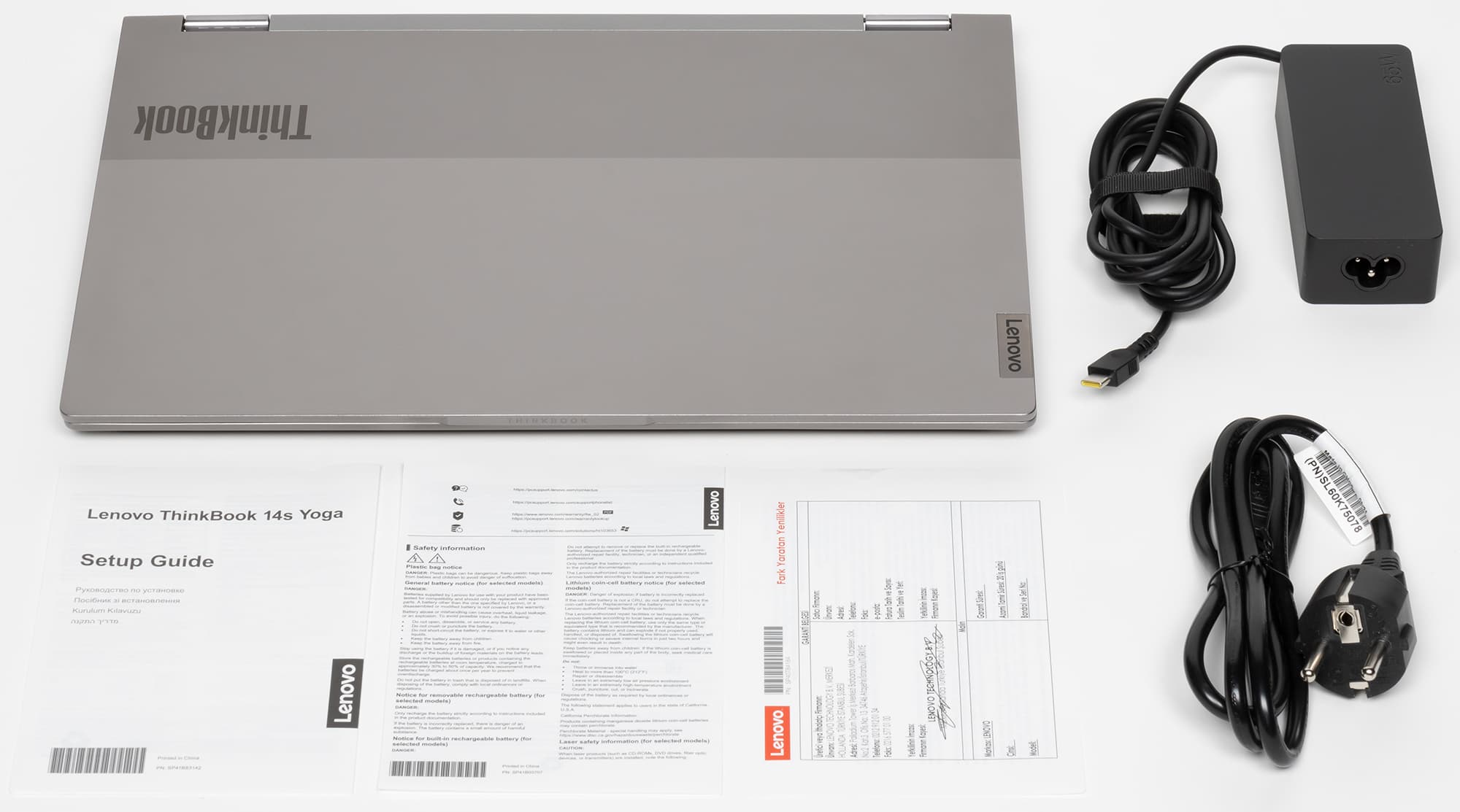 Внешняя упаковка представляет собой невзрачную коробку из утилизированного бумажного сырья с логотипом Lenovo в верхнем левом углу, серой полосой и надписью ThinkBook снизу. Коробка не имеет пластмассовой ручки-вставки, поэтому переносить ее неудобно, а повторно использовать — бессмысленно: пространство внутри не предусматривает отдельных отсеков для хранения принадлежностей (кроме бокового пенала для блока питания).