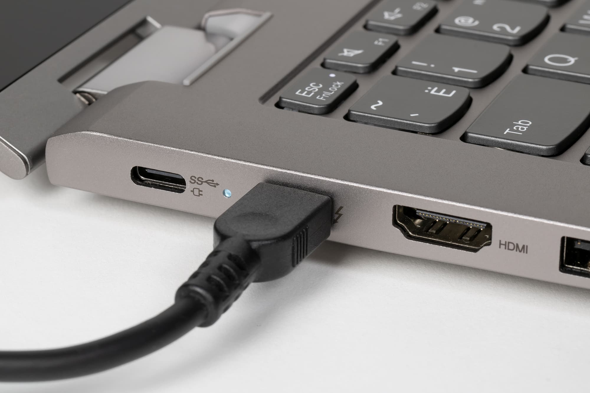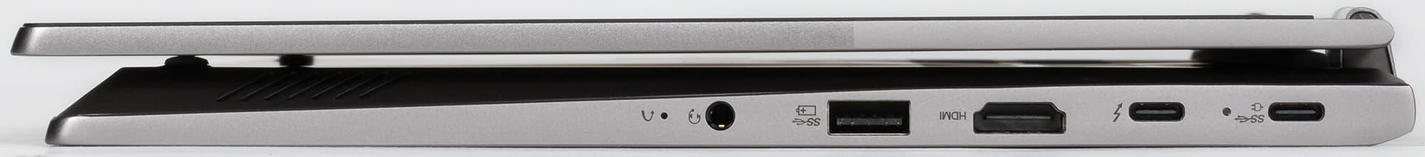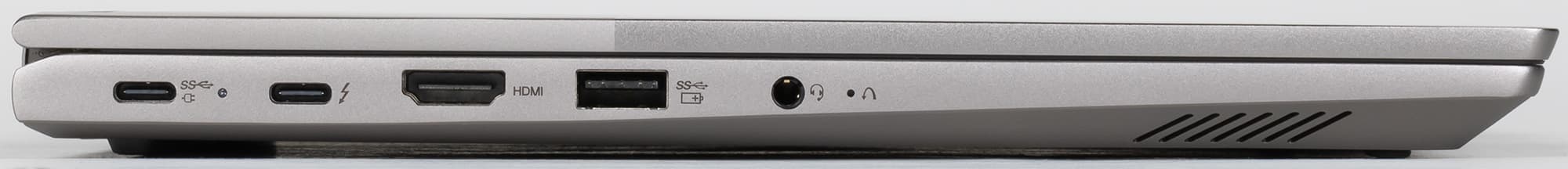 Слева расположены два разъема USB3 Type-C, заряжать ноутбук можно подключением адаптера питания к любому из них. Второй слева порт поддерживает интерфейс Thunderbolt 4. Затем слева направо следуют: видеовыход HDMI, порт USB3 Type-A, универсальный миниджек 3,5 мм для подключения наушников или стереогарнитуры, отверстие для доступа к кнопке сброса.