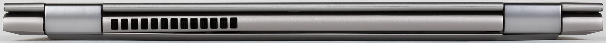 Для наглядности демонстрируем те же разъемы в планшетном режиме с перевернутой крышкой. Кстати, в этом ракурсе отчетливо видно, в какой мере важно учитывать толщину устройства именно с учетом опор: последние становятся прокладками между крышкой и корпусом и увеличивают это измерение в планшетном положении.