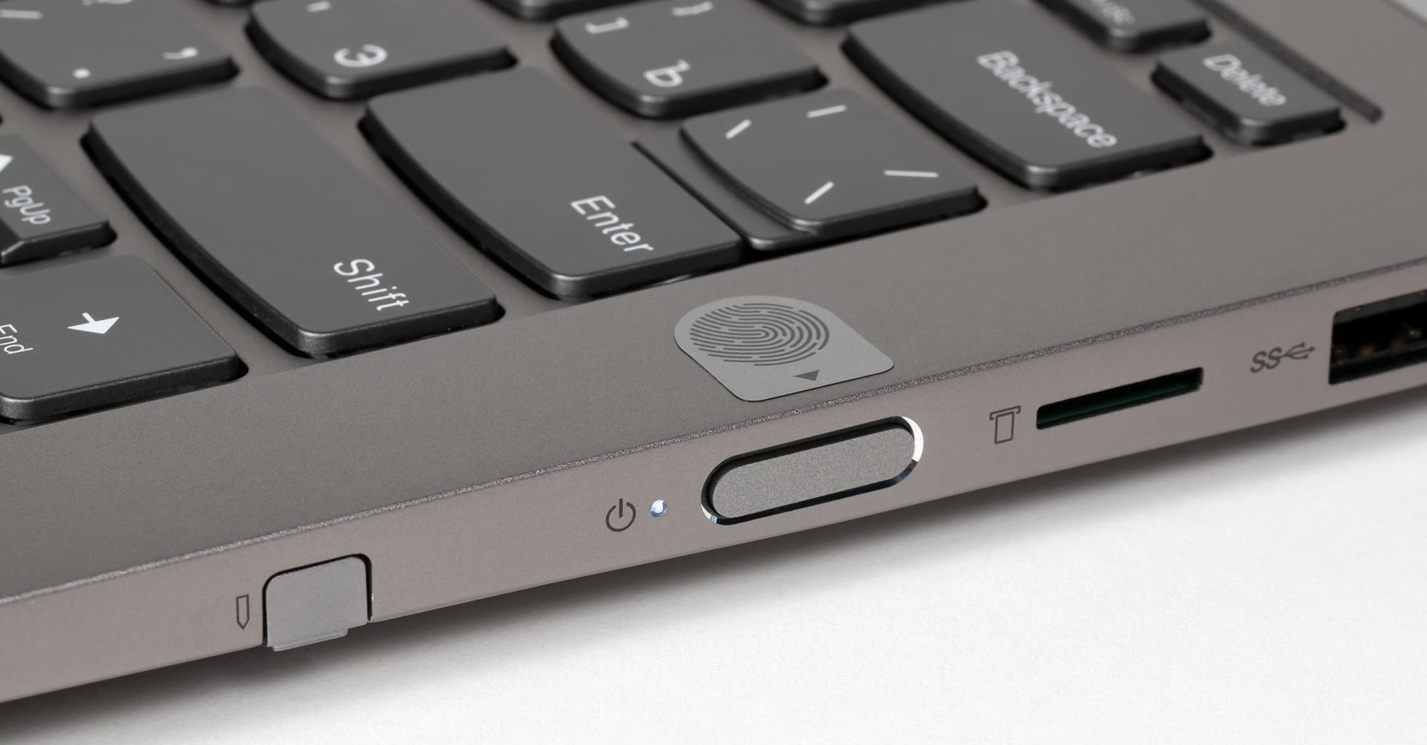 Выключатель питания совмещен с дактилоскопическим сканером. Маркирующий стикер, свидетельствующий об этом, приклеен к лицевой стороне клавиатурной панели, и это очень полезно, потому что при взгляде сверху нелегко сразу определить, где именно находится самая важная кнопка. При запуске устройства идентификация пользователя происходит сразу и автоматически, в момент нажатия на выключатель, что избавляет от необходимости производить дополнительные действия (ввод PIN или пароля и т. д.). Эта функция поддержана на уровне BIOS.