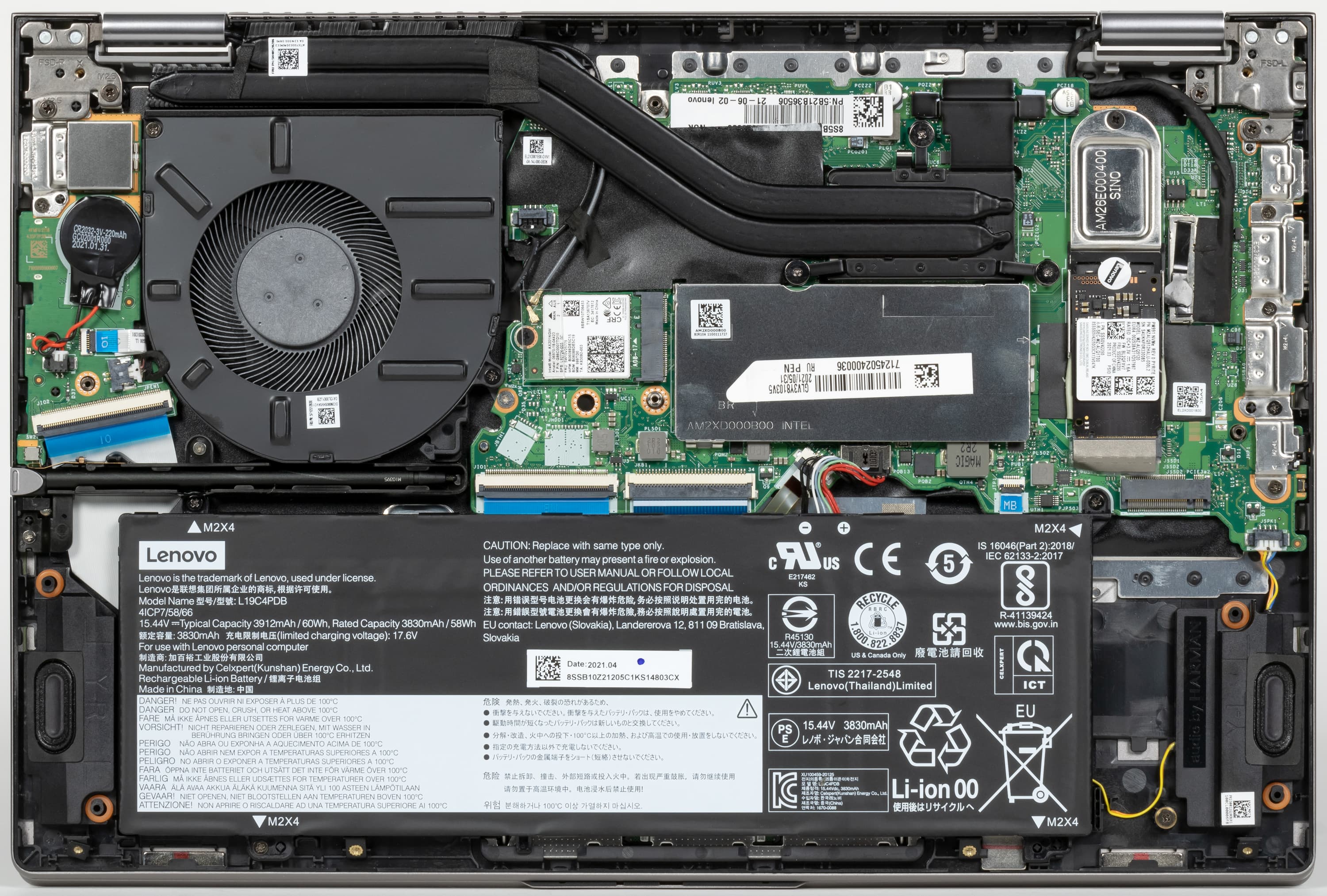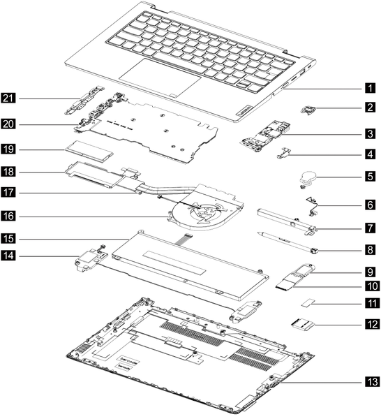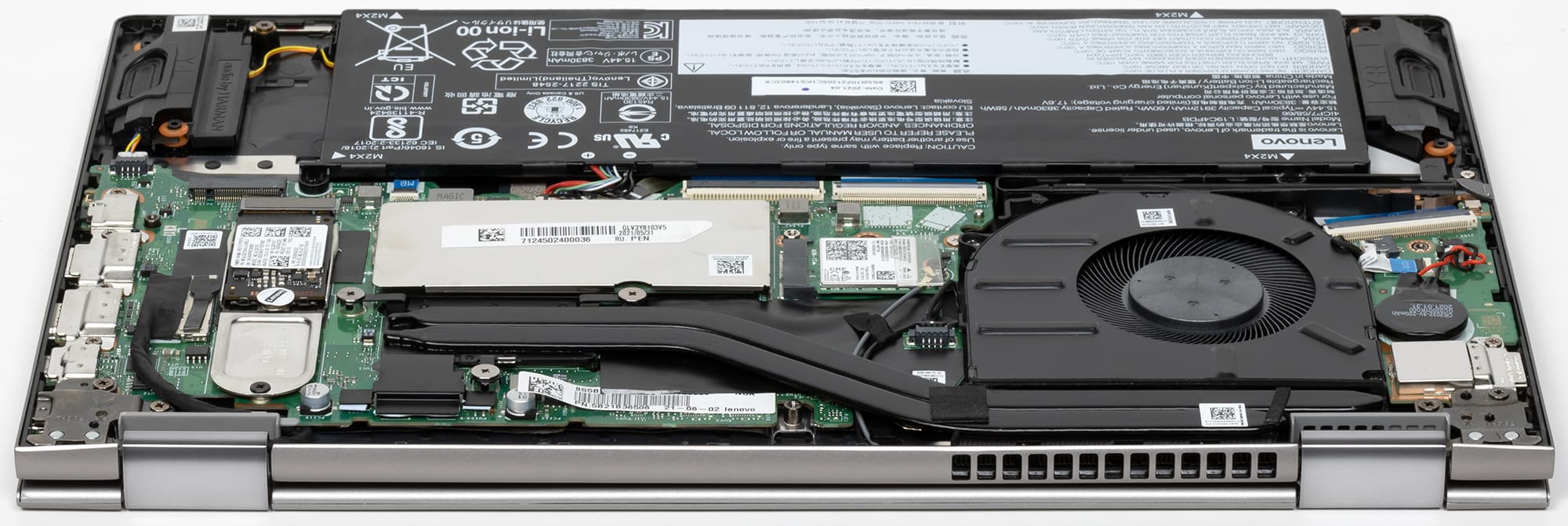 Принцип организации Lenovo ThinkBook 14s Yoga ITL модульный. Монтажные блоки компонентов оптимизированы с целью максимального ускорения заводской сборки и возможной замены.