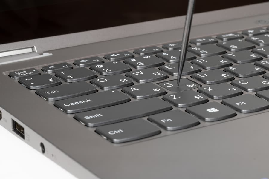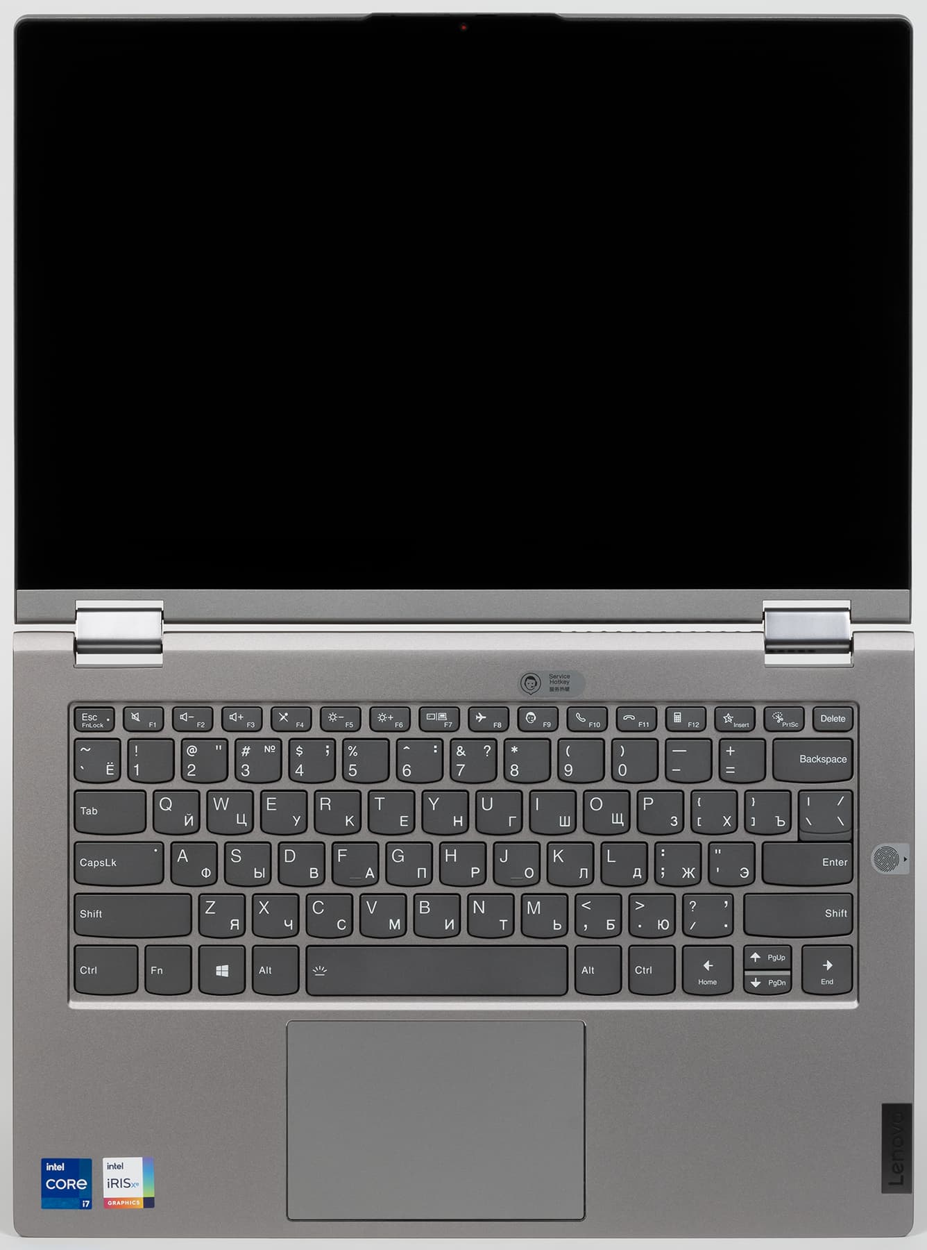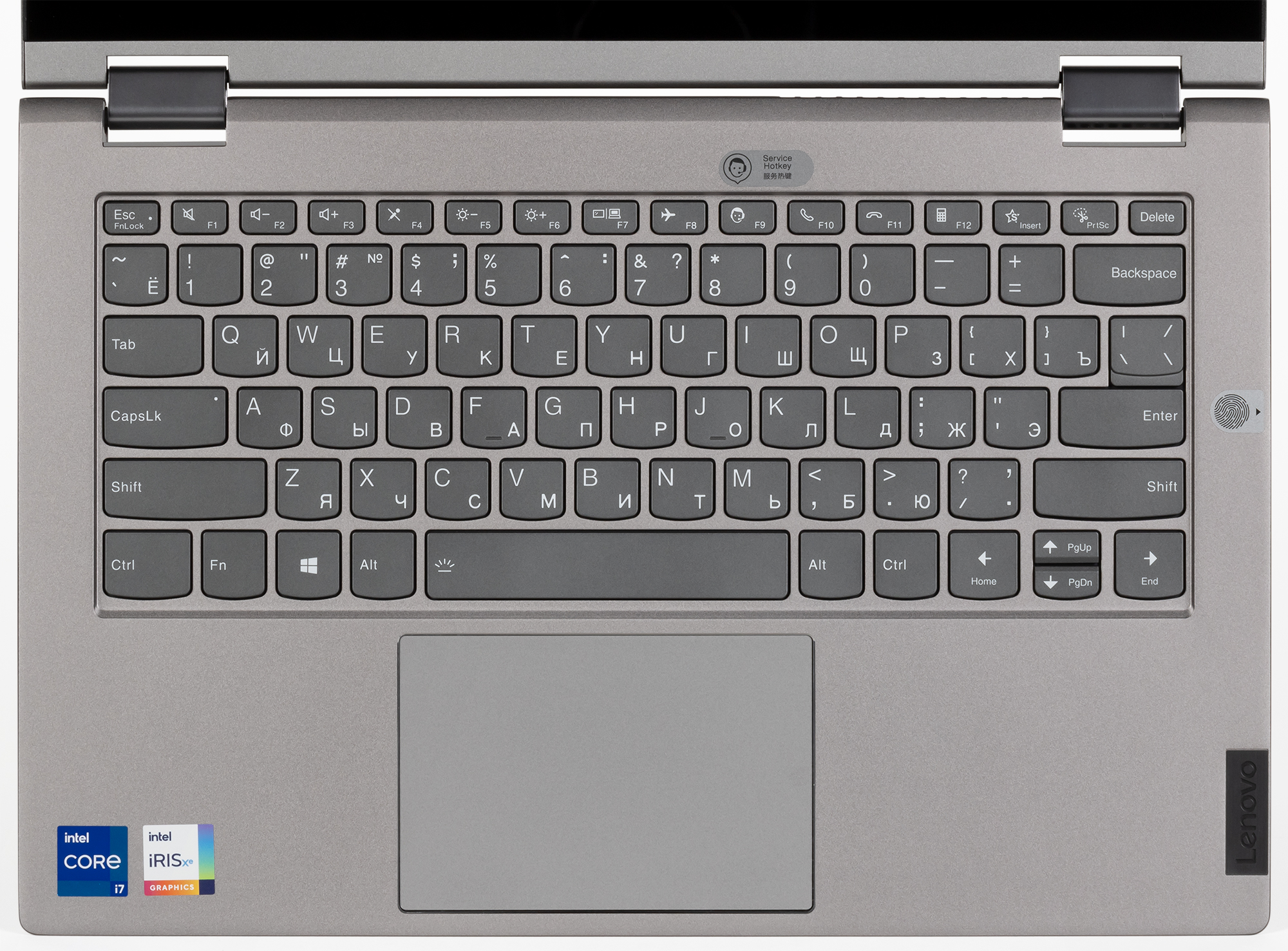 В Lenovo ThinkBook 14s Yoga ITL используется полноразмерная клавиатура мембранного типа с традиционно небольшим вертикальным ходом кнопок (около 1,5 мм). По топографии зон, раскладке и функциональности она несколько урезана по сравнению со стандартной десктопной конфигурацией: отсутствуют цифровой блок и шестиклавишная навигационная зона. Поэтому Insert, Delete. Home, End, Page Up, Page Down заменены другими клавишами в аккорде с регистровыми Fn и Shift. Стрелки сохранены, но те из них, которые обеспечивают перемещение по вертикали, сильно уменьшены, и пользоваться ими неудобно.