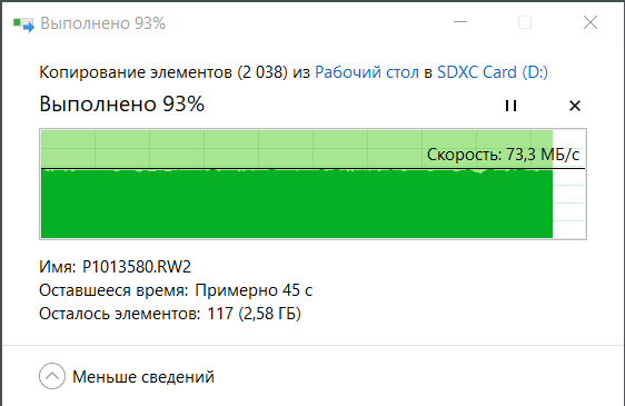 Копирование файлов с карты памяти на Рабочий стол трансформера заняло 8 минут 32 секунды при средней скорости 85,6 МБ/с.