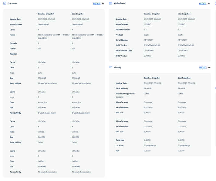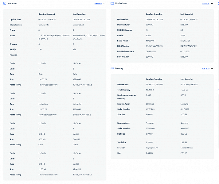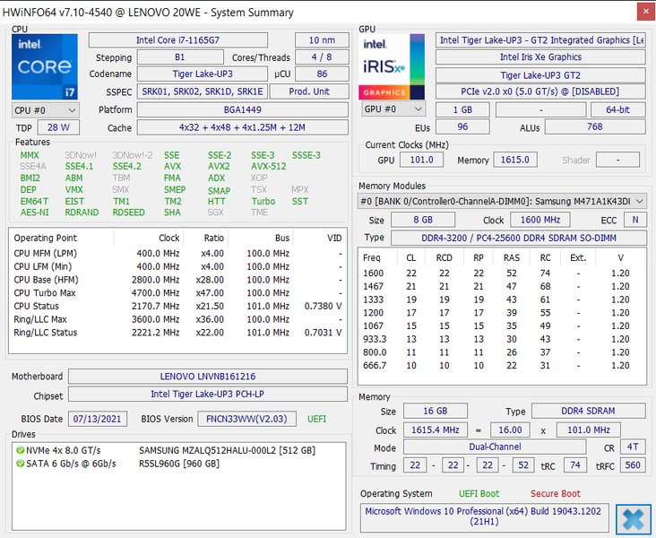 В ноутбуке используется 4-ядерный (8-поточный) мобильный процессор 11-го поколения Intel Core i7-1165G7 (кодовое наименование Tiger Lake). Он производится в соответствии с 10-нанометровыми технологическими нормами производственного процесса SuperFin. Официальные частоты составляют 2,8/4,7 ГГц, штатное тепловыделение — 28 Вт. В тестах под нагрузкой мы видели, что в составе Lenovo ThinkBook 14s Yoga ITL вычислитель в состоянии стабильно и длительно работать на частоте 2,9 ГГц при потреблении до 24 Вт.