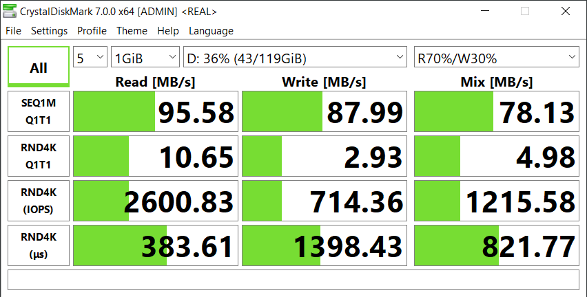 Lenovo ThinkBook 14s Yoga ITL оснащен устройством для работы с картами памяти microSD. Это весьма полезно для тех, кто часто обменивается информацией между цифровыми камерами, смартфонами и планшетами, с одной стороны, и ноутбуками — с другой. Для того чтобы убедиться в потребительских качествах картовода, мы предприняли тестирование скорости копирования данных с использованием носителя microSDXC SanDisk Extreme Plus Class 10 (A2, V30) емкостью 128 ГБ с максимальными паспортными скоростями чтения 160 МБ/с и записи 90 МБ/с, но сначала испытали карту в традиционном тесте CrystalDiskMark.
