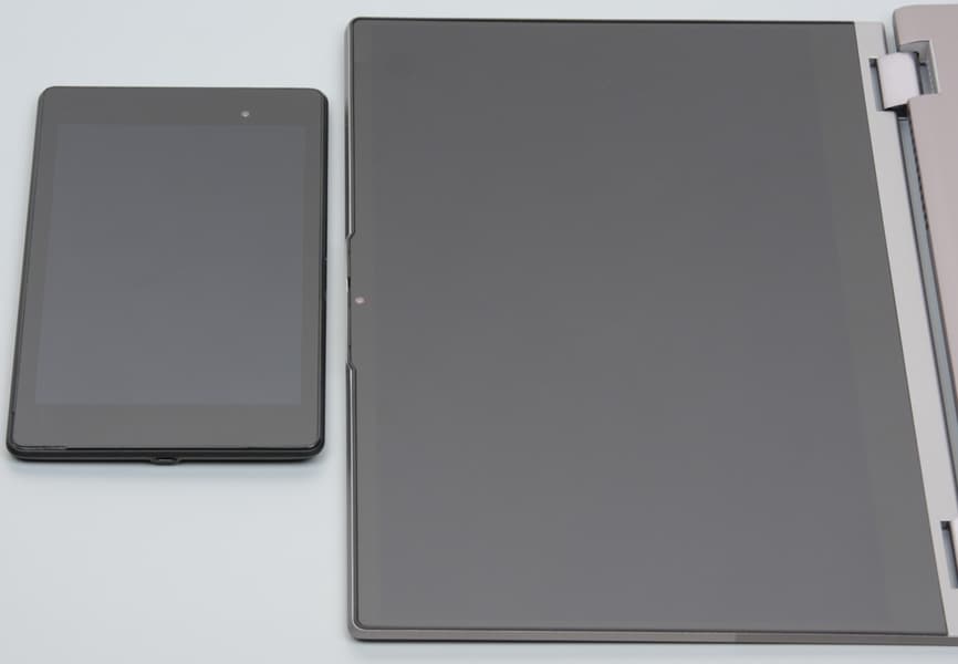 Бесполезная черная часть справа и слева от экрана имеет ширину 5 мм, сверху над экраном — 10 мм, а в центральной части, где установлена веб-камера, — 12 мм. Над поверхностью стекла на 2 мм выступает металлическая окантовка крышки. Она позволяет сохранить дистанцию между поверхностью экрана и клавиатурой.