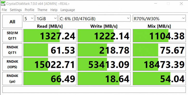 Машина оснащена твердотельным NVMe-накопителем в слоте M.2, обладающим неформатированной емкостью 512 ГБ. В рабочей конфигурации после установки Windows 10 со служебными разделами на SSD доступно 476 ГБ.