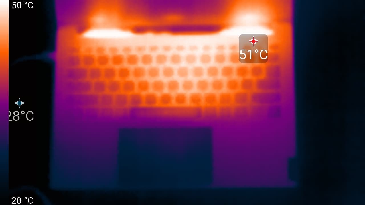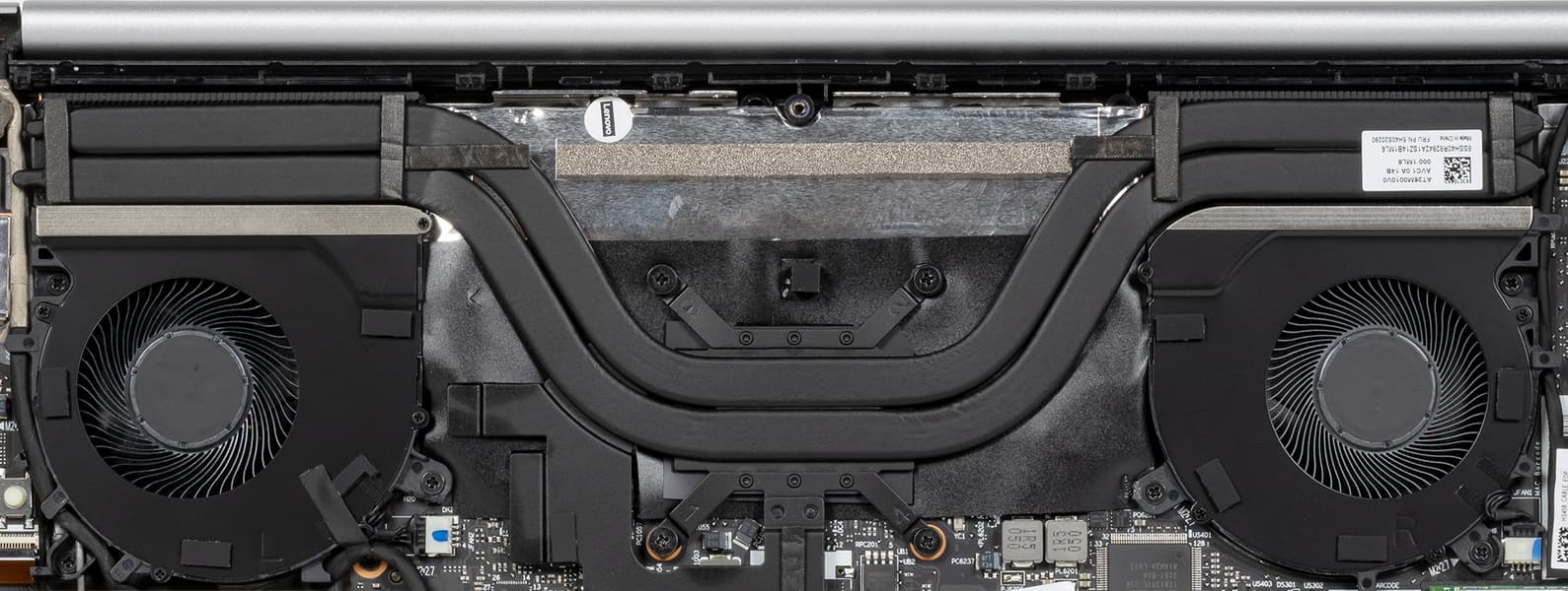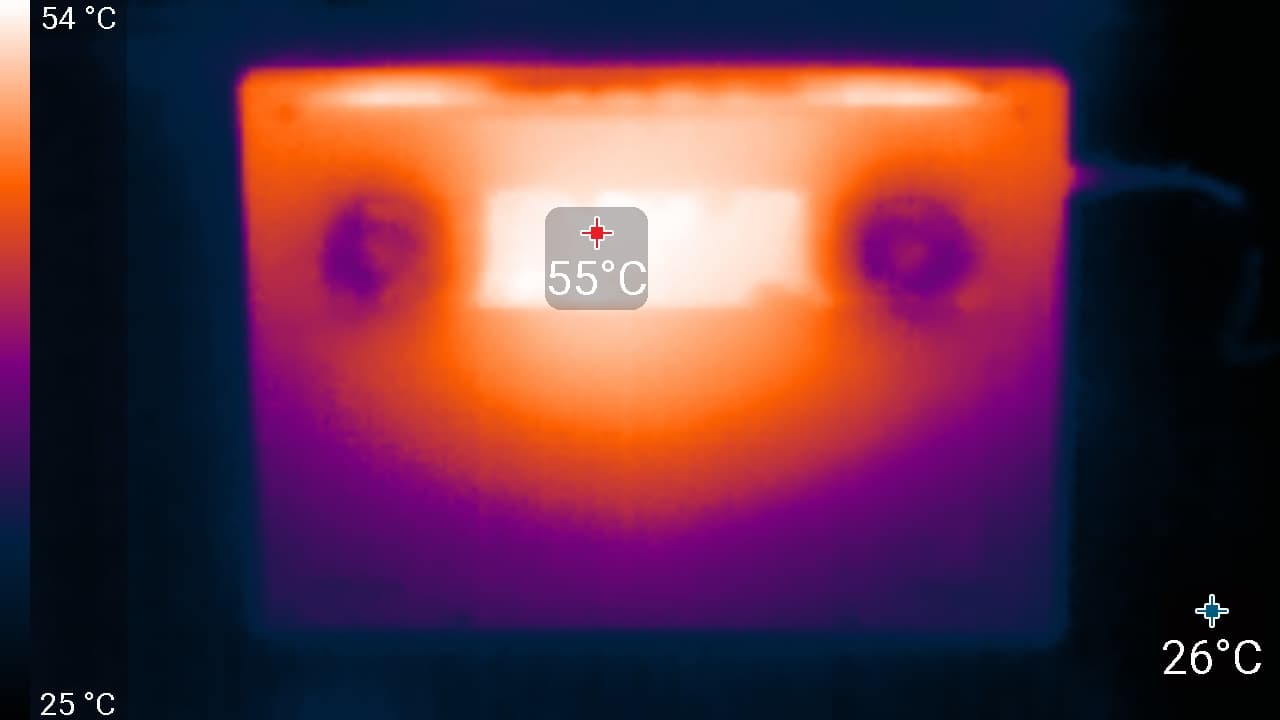 Если ноутбук не нагружать совсем, то его система охлаждения при выбранном профиле «Экономия заряда аккумулятора», кажется, может работать полностью в пассивном режиме, а в других режимах кулеры иногда все-таки включаются, реагируя на какие-то фоновые процессы. В самом экономичном режиме шум от системы охлаждения почти отсутствует и под предельной нагрузкой на процессор (надо нагибаться к вентиляционным отверстиям, чтобы понять, что кулеры включились). В случае профиля «Интеллектуальное охлаждение» при типичной нагрузке шум тоже невысокий — различимый, но не более. Включение профиля «Максимальная производительность» увеличивает одноименную характеристику и потребление, как и уровень шума, но все равно этот уровень остается невысоким, если сравнивать с игровыми ноутбуками. Характер шума ровный и раздражения не вызывает. В целом мы очень высоко оцениваем систему охлаждения этого ноутбука, если не забывать про то, что под нагрузкой здесь работает 45-ваттный процессор, а не ультрамобильный.