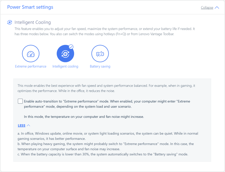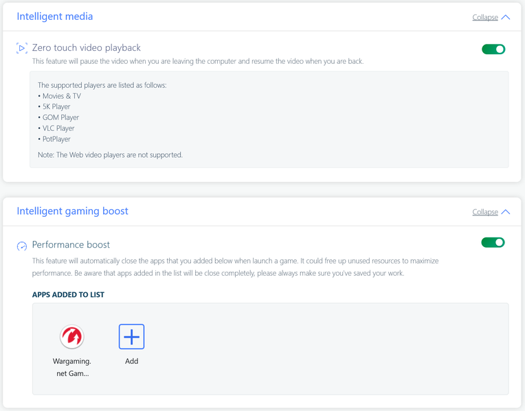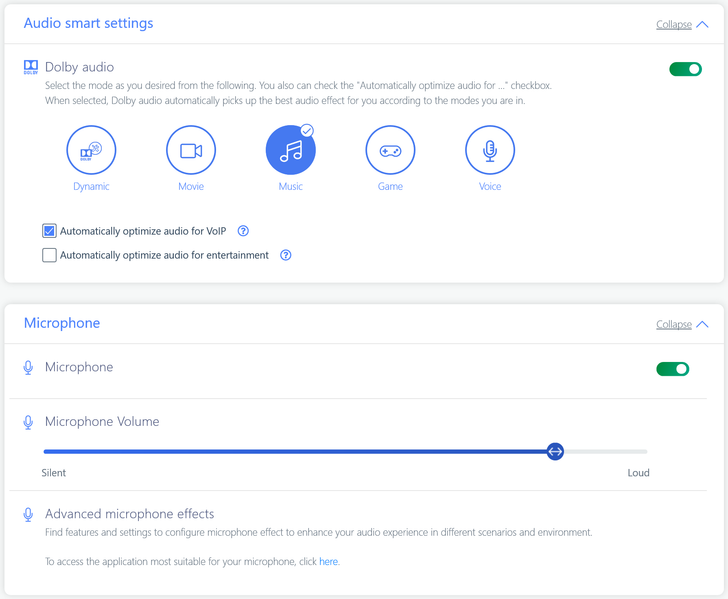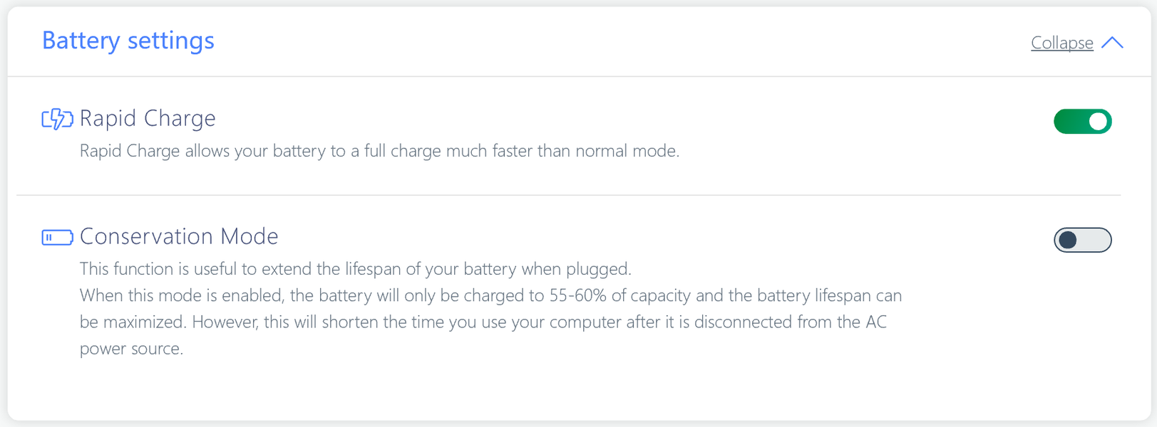 Наиболее интересны возможности утилиты, связанные с управлением аппаратными компонентами. В их числе есть две настройки зарядки батареи (о них мы подробнее поговорим в соответствующем разделе), а также традиционный выбор профиля энергопотребления и работы системы охлаждения (то же самое). Здесь же доступны переключение аудиопрофилей Dolby, выключение микрофона и камеры, еще некоторые описанные в других разделах настройки.