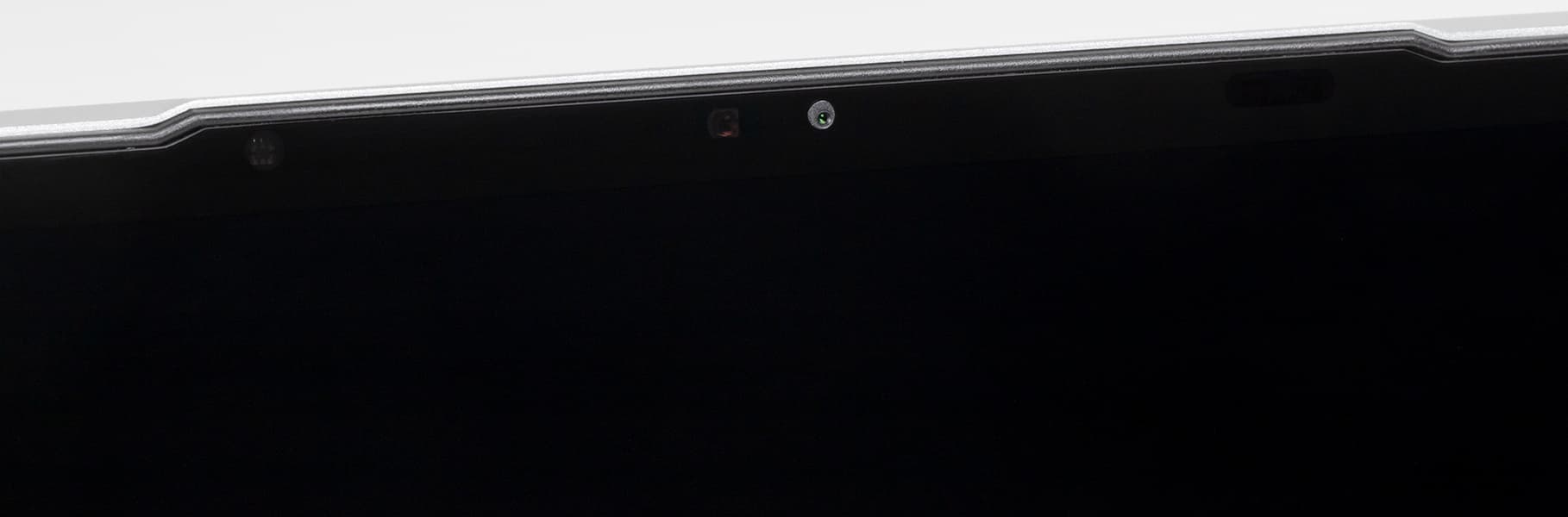 Экран на крышке прикрыт стеклом, толщина рамки вокруг него составляет 9 мм сверху, 6 мм по бокам и 15 мм до рабочей поверхности снизу. По центру сверху крышка образует выступ, там рамка визуально толще, и в этой части разместились веб-камера с сигнальным светодиодом, датчик освещенности, датчик присутствия, инфракрасная подсветка и микрофоны. Штатного способа отключить или зашторить камеру не предусмотрено. ИК-излучатели помогают камере, имеющей совмещенную ИК+RGB-матрицу, распознавать лицо даже в темноте, благодаря чему всегда можно использовать авторизацию Windows Hello. По характеристикам съемки камера совершенно стандартная (720p@30 fps), однако применяется какой-то интеллектуальный фильтр, сглаживающий шумы на статичном изображении. В результате качество видео все-таки получше, чем обычно бывает в ноутбуках, хотя предпочтительнее ли мыло, чем шумы — вопрос неоднозначный.