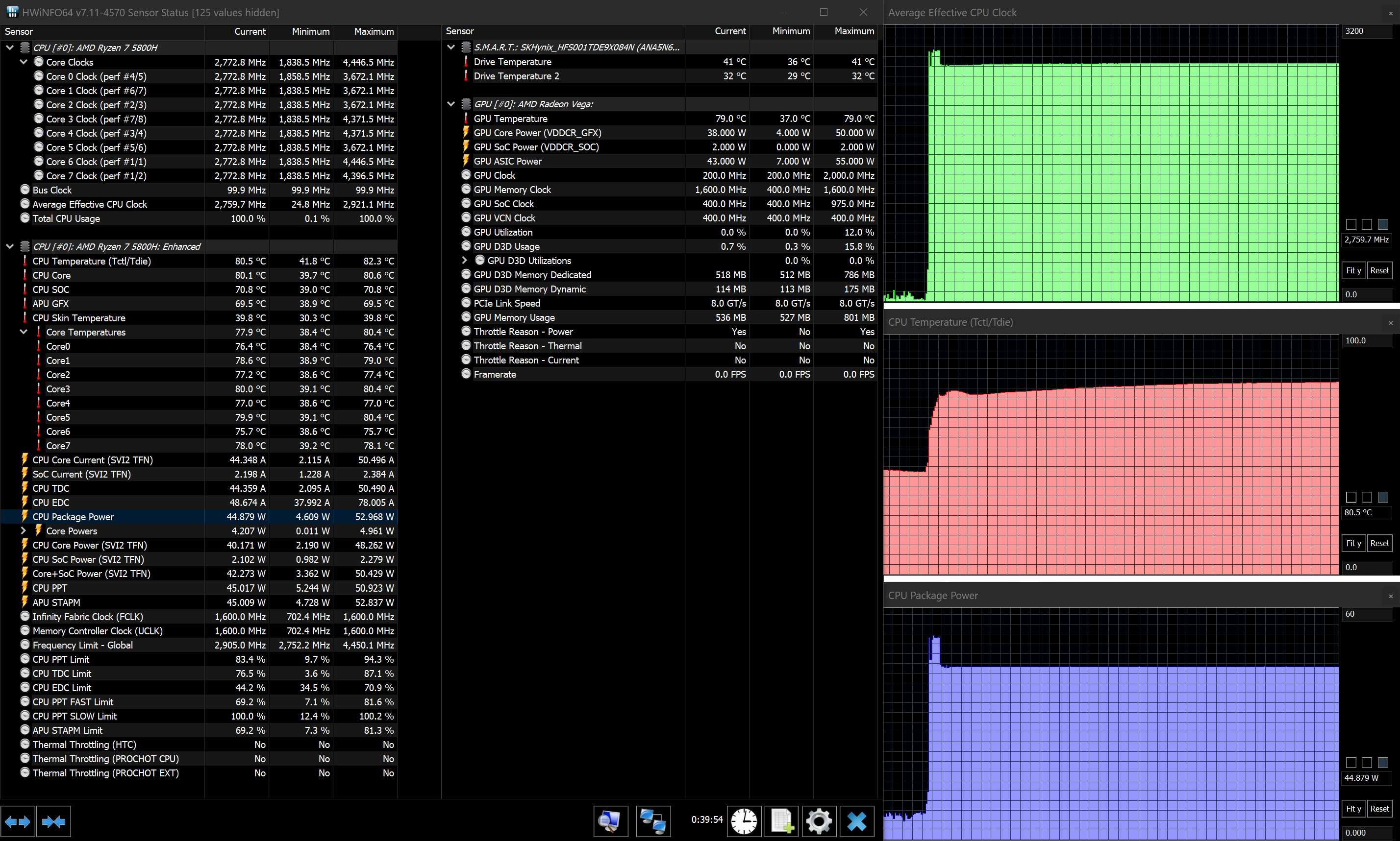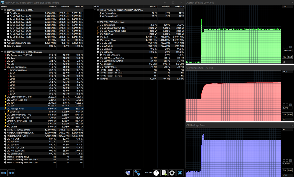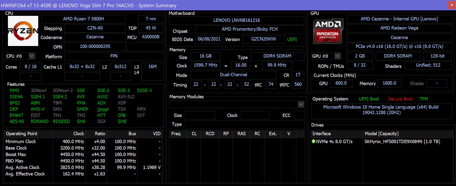 В ноутбуке используется 8-ядерный (16-поточный) процессор AMD Ryzen 7 5800H (Cezanne) из «полноценной», не ультрамобильной линейки. Внушительное число ядер, причем самого современного поколения Zen3, высокая частота, солидный теплопакет 45 Вт (и тесты под нагрузкой подтверждают данный уровень потребления, то есть система охлаждения не ограничивает процессор) — все это в совокупности заставляет предполагать очень серьезный уровень производительности. Также в этот процессор интегрировано видеоядро Vega 8, и за неимением дискретной видеокарты именно оно отвечает за отрисовку рабочего стола и производительность в играх. Впрочем, об этом мы поговорим в следующем разделе.