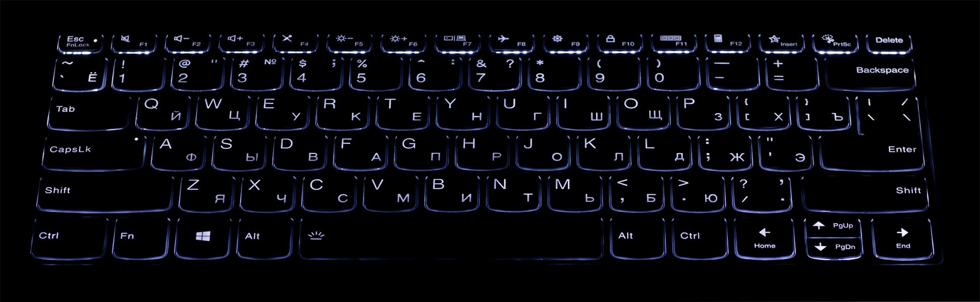 Клавиши имеют простую белую подсветку, яркость можно изменить вручную (2 уровня + выключение) или использовать автоматическую регулировку в зависимости от освещенности, что будет удачно сочетаться с автоматической же регулировкой яркости экрана.