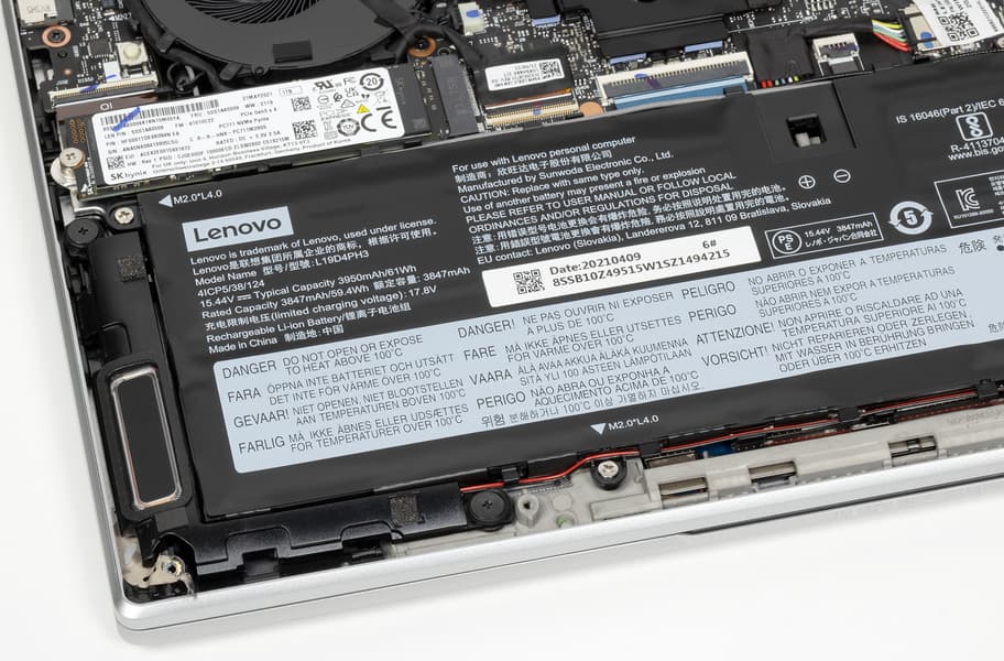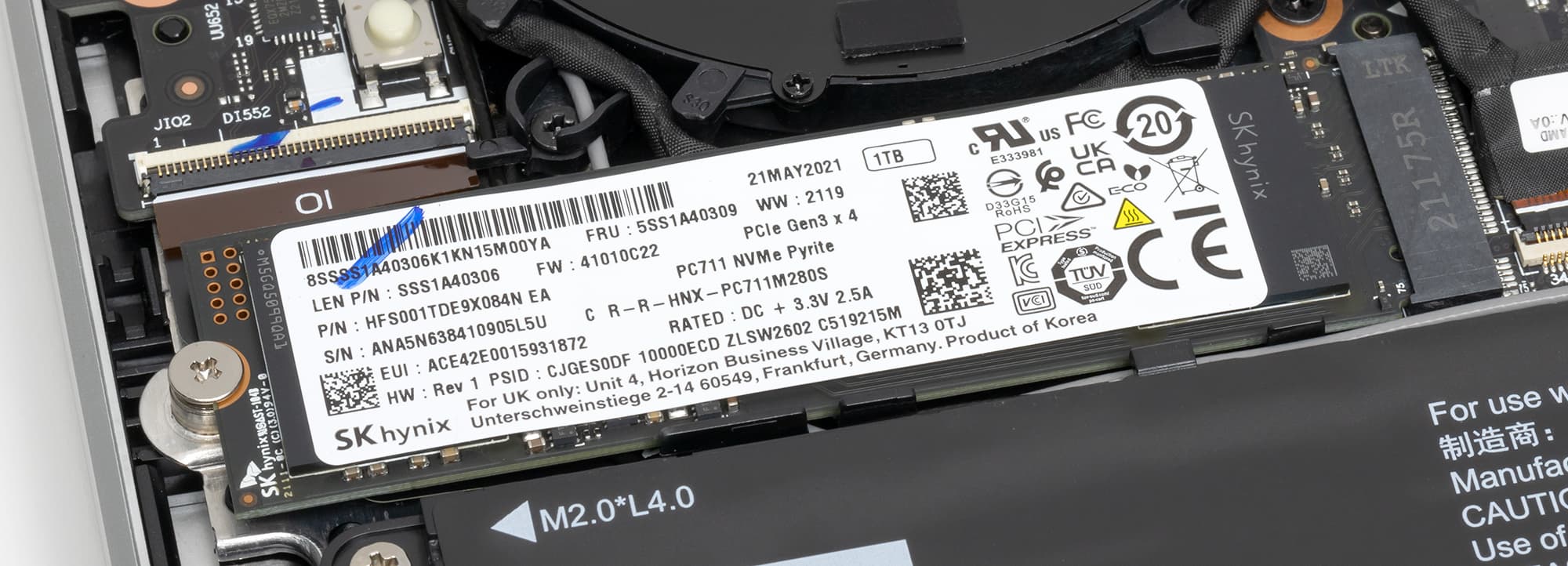 В нашей модификации ноутбука был установлен SSD-накопитель SK Hynix HFS001TDE9X084N на 1 ТБ. Это NVMe-диск, установленный в слот M.2 и подключенный к внутреннему порту PCIe 3.0 x4. Базовые скоростные показатели у накопителя по ноутбучным меркам высокие.