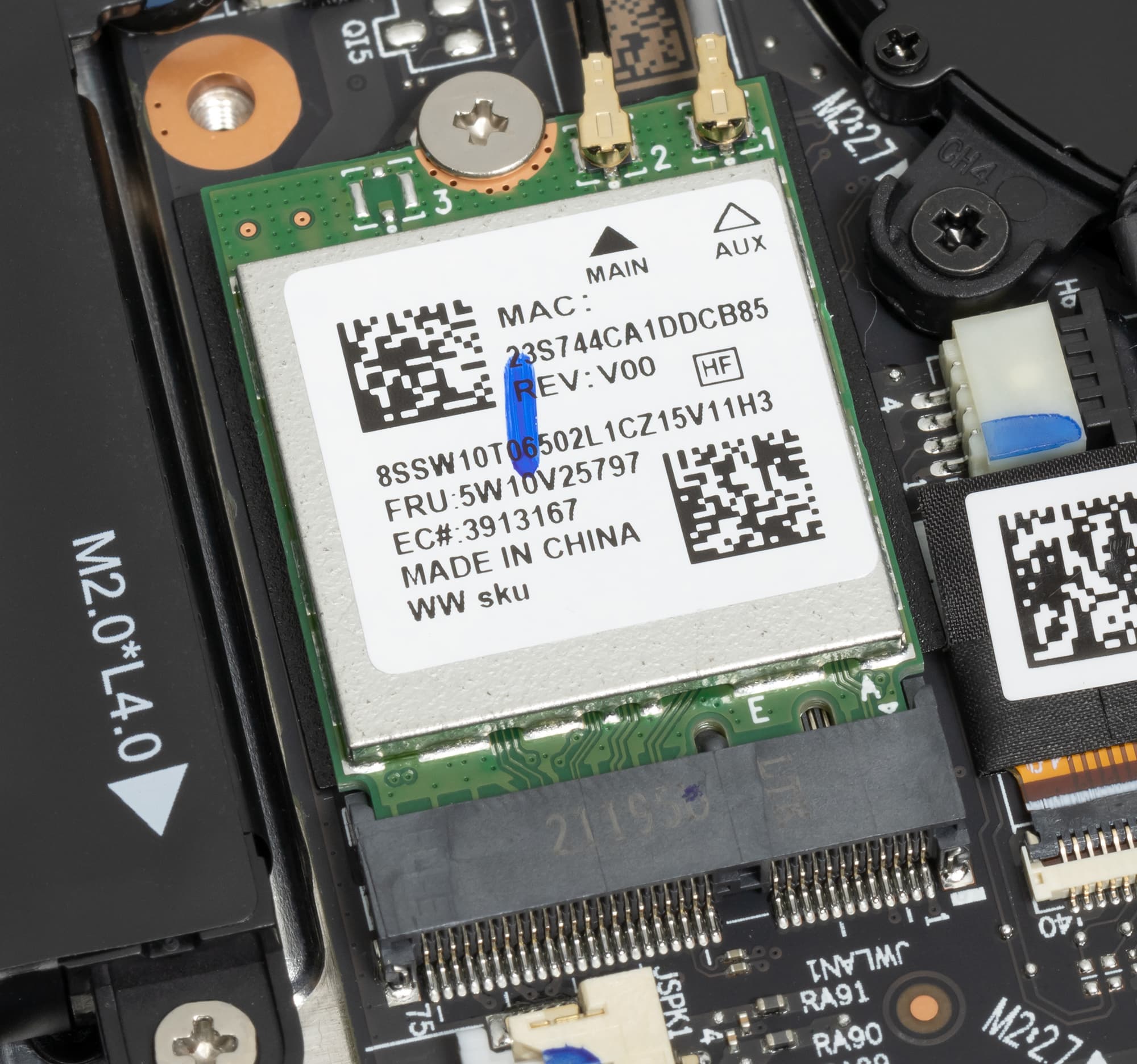 Чтобы снять нижнюю панель корпуса, надо открутить несколько винтиков со шлицом Torx. Это открывает доступ к кулеру, батарее, беспроводному сетевому адаптеру и SSD-накопителю в слоте M.2. Чипы памяти распаяны на плате. Второго слота M.2 не предусмотрено.