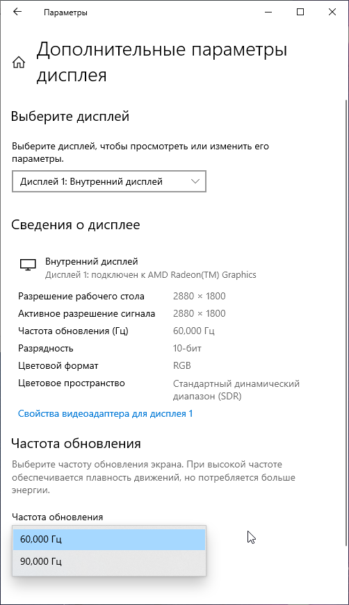 В настройках экрана на выбор доступны две частоты обновления — 60 и 90 Гц. По крайней мере, при родном разрешении экрана вывод идет с глубиной цвета 10 бит на цвет (при 60 и 90 Гц).