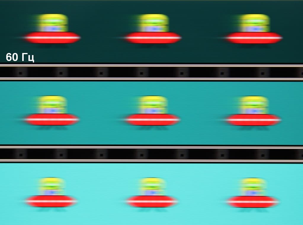 Для наглядного представления о том, что на практике означает такая скорость матрицы, приведем серию снимков, полученных с помощью движущейся камеры. Такие снимки показывают, что видит человек, если он следит глазами за двигающимся на экране объектом. Описание теста приведено тут, страница с самим тестом тут. Использовались рекомендованные установки (скорость движения 960 пиксель/с в случае 60 Гц и 990 пиксель/с в случае 90 Гц) , выдержка 1/15 с, на фотографиях указаны значения частоты обновления.