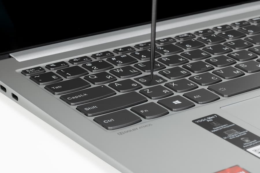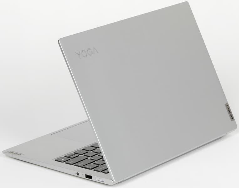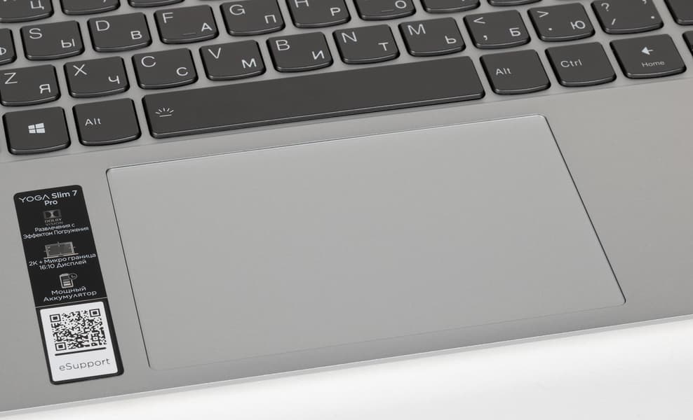 Металлические панели корпуса у Lenovo Yoga Slim 7 Pro 14ACH5 выполнены из алюминия, отделка везде одинаковая, матовая без фактуры. В нашем случае модель была светло-серого цвета, еще есть темно-серый вариант, который по фотографиям смотрится даже лучше.