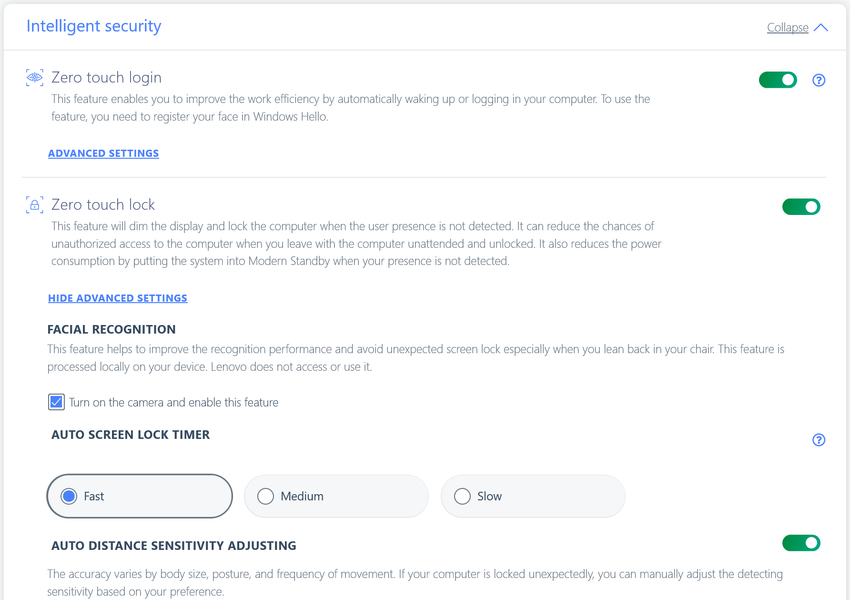 Есть в Lenovo Vantage и любопытный набор интеллектуальных технологий, завязанных на работу камеры и датчика присутствия. Если ноутбук определяет, что пользователь отошел, то он буквально через несколько секунд ставит на паузу просмотр видео (должен использоваться совместимый плеер, браузер не подойдет), а еще через какое-то время и вовсе блокирует Windows. При возвращении пользователя и распознании его лица Windows автоматически разблокируется, а воспроизведение видео снимается с паузы. Для работы этих технологий должна быть включена функция Windows Hello и авторизация по лицу. Блокировка операционной системы у нас почему-то не срабатывала, а вот остановка просмотра видео функционировала идеально.