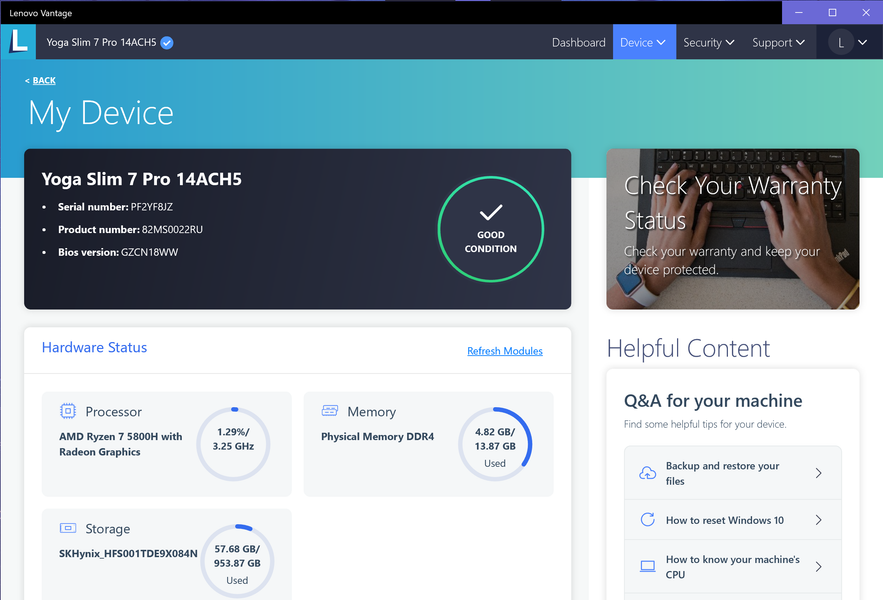 Ноутбук поставляется с Windows 10 только Домашней редакции (что немного странно с учетом его профессионального позиционирования). На момент тестирования уже было доступно обновление до Windows 11. Основная фирменная утилита производителя называется Lenovo Vantage. В ней можно получить базовую информацию по конфигурации ноутбука, узнать его гарантийный статус, провести тестирование аппаратных компонентов в поисках неисправностей, убедиться, что включены все необходимые модули безопасности (антивирус, брандмауэр, контроль учетных записей и пр.), найти и установить обновления ОС, драйверов, BIOS и фирменных утилит.