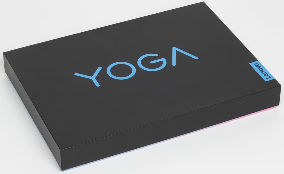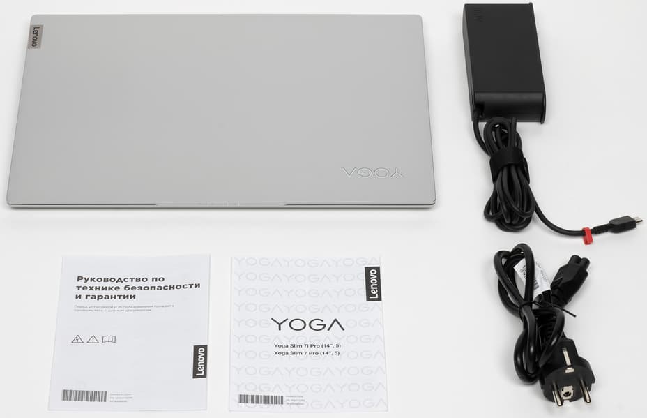 Ноутбук продается в небольшой симпатичной коробке (при покупке она, естественно, будет упакована дополнительно в транспортировочную коробку). В комплекте, кроме печатной продукции, можно найти только сравнительно небольшой адаптер питания на 95 Вт весом около 300 г с суммарной длиной двух кабелей 2,7 м. Адаптер питания приспособлен для установки на стол на боку, кабель с разъемом USB Type-C от адаптера питания является несъемным.