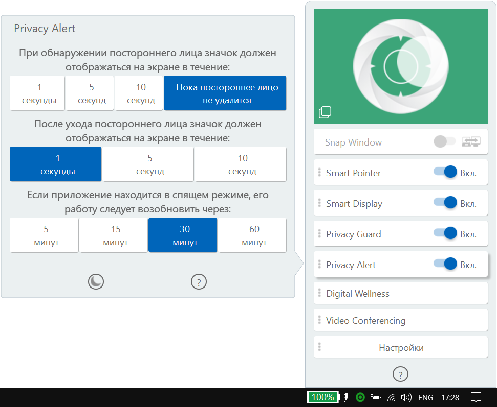 Предустановлена на ноутбуке и утилита Glance компании Mirametrix, отслеживающая направление взгляда пользователя и некоторые другие параметры и в соответствии с этим автоматизирующая некоторые действия. Например, она перемещает открытое окно приложения на тот экран, на который пользователь смотрит в данный момент, а также перемещает туда курсор мыши (это актуально, конечно, при подключении к ноутбуку дополнительных мониторов). Помимо этого, программа размывает изображение на том экране (или тех экранах), куда не смотрит пользователь. Glance умеет предупреждать, когда кто-то подглядывает на экран ноутбука из-за плеча пользователя, предупреждает о том, что пользователь сутулится или слишком долго не делал зарядку для глаз. В общем, забавно. И любая функция отключается, так что можно использовать только актуальное для конкретного человека и конкретной ситуации.
