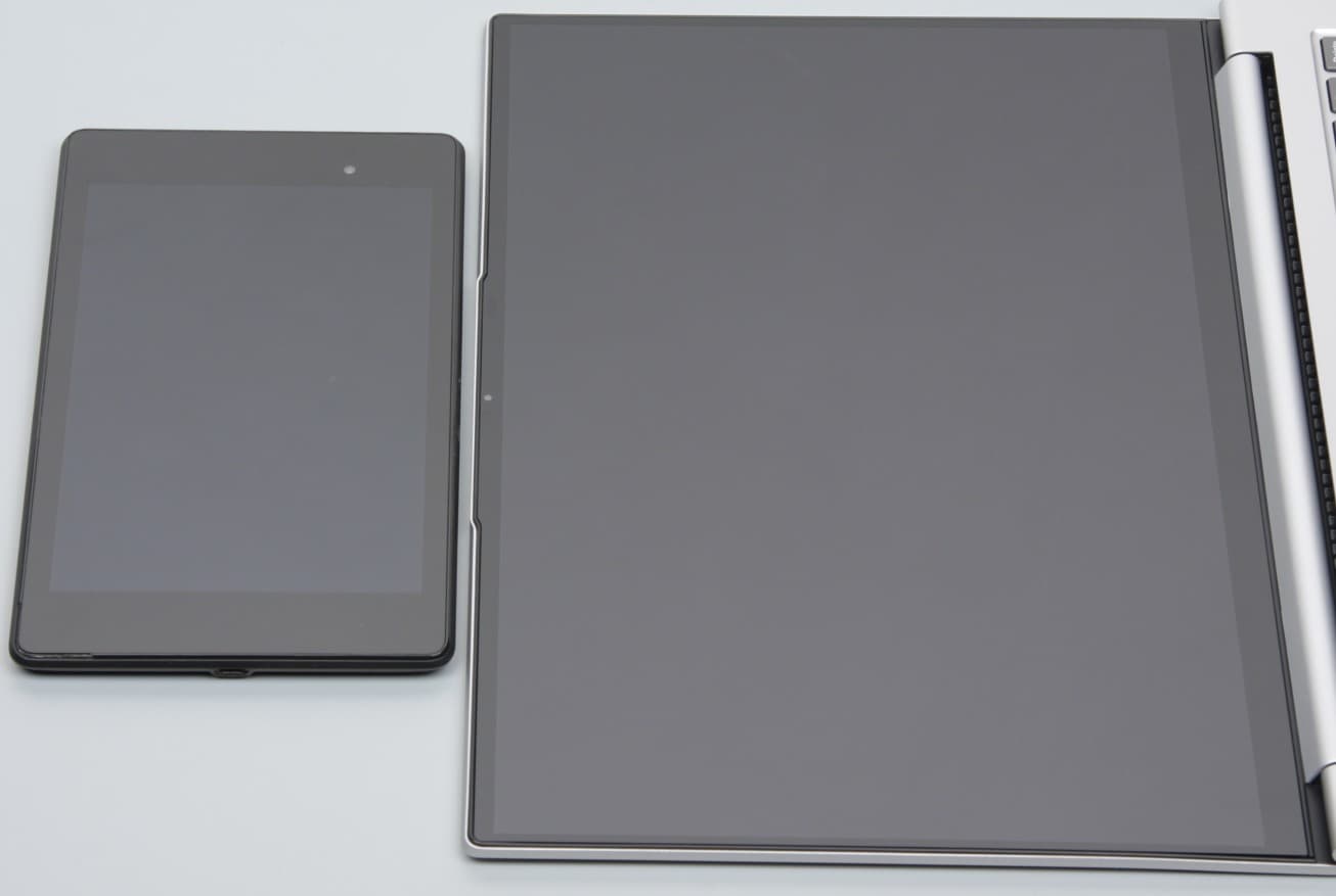 Лицевая поверхность экрана изготовлена из стеклянной пластины, устойчивой к появлению царапин. Экран снаружи зеркально-гладкий. На внешней поверхности экрана нет специального олеофобного (жироотталкивающего) покрытия, поэтому следы от пальцев удаляются с трудом, а появляются быстро. Впрочем, экран не сенсорный, поэтому особых причин тыкать в него пальцами нет. Судя по яркости отраженных объектов, антибликовые свойства экрана не хуже, чем у Nexus 7. Для наглядности приведем фотографию, на которой в экранах обоих устройств отражается белая поверхность (где что — разобраться несложно):