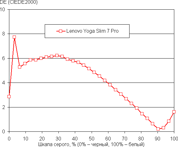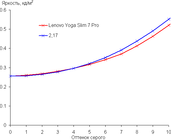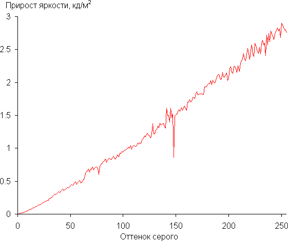 Далее мы измерили яркость 256 оттенков серого (от 0, 0, 0 до 255, 255, 255). График ниже показывает прирост (не абсолютное значение!) яркости между соседними полутонами: