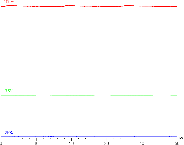 На любом уровне яркости значимая модуляция подсветки отсутствует, поэтому нет и никакого мерцания экрана. В доказательство приведем графики зависимости яркости (вертикальная ось) от времени (горизонтальная ось) при различных значениях настройки яркости: