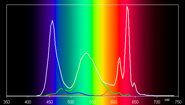 Поэтому визуально цвета изображений, ориентированных на вывод в пространстве sRGB, на этом экране имеют естественную насыщенность. Ниже приведен спектр для белого поля (белая линия), наложенный на спектры красного, зеленого и синего полей (линии соответствующих цветов):