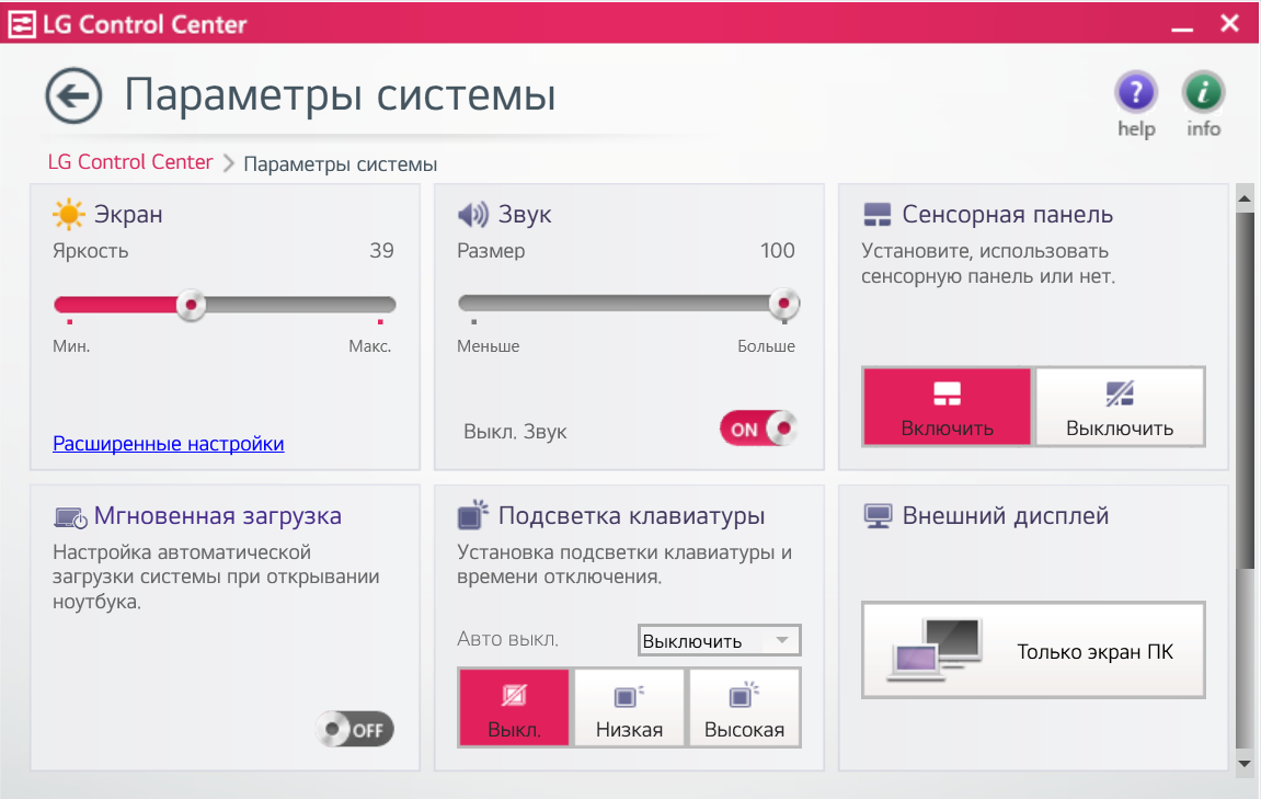 Здесь можно проверить и изменить системные параметры (экран, звук, сеть, клавиатура и кликпад),