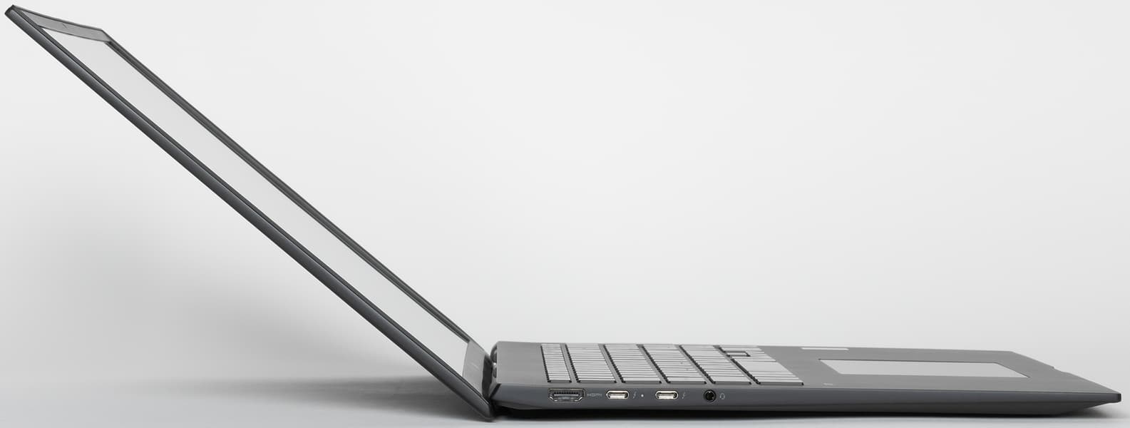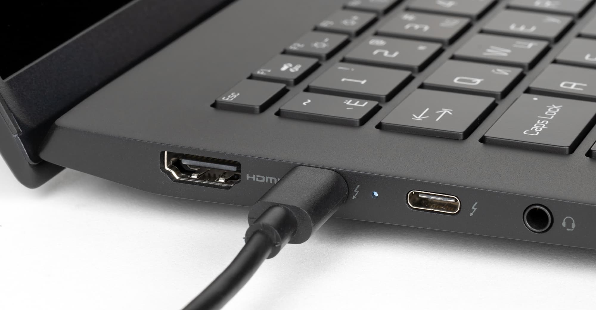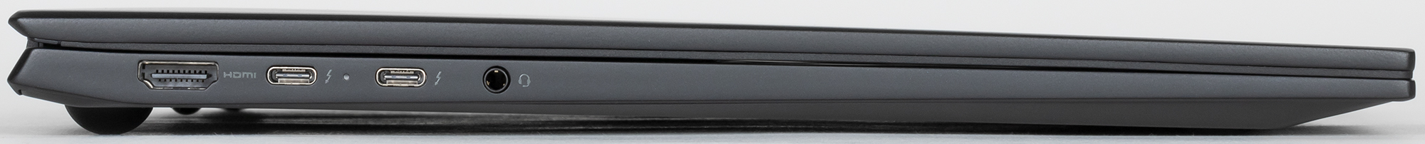 Слева расположены видеовыход HDMI, два разъема USB4 Type-C/Thunderbolt 4 и комбинированный аудиоразъем. Заряжать ноутбук можно подключением адаптера питания к любому из разъемов USB Type-C. Вдобавок, второй (слева) разъем поддерживает вывод графики DisplayPort и зарядку мобильных устройств Power Delivery.