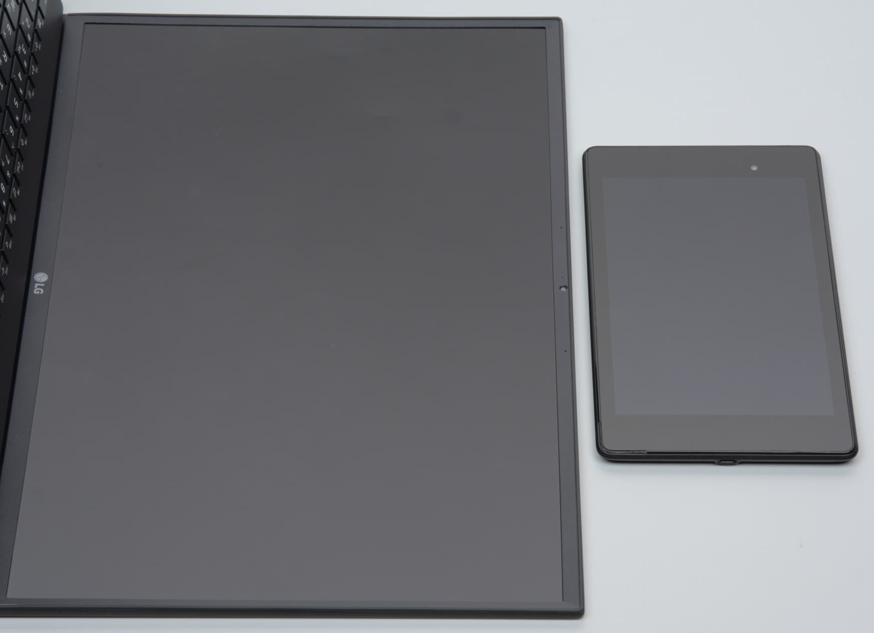 Рамка вокруг экрана справа и слева имеет ширину 6 мм, сверху — 9 мм. Над глянцевой поверхностью на 2 мм выступает окантовка крышки, позволяющая в закрытом состоянии сохранить дистанцию и избежать контакта между стеклом дисплея и клавиатурой.