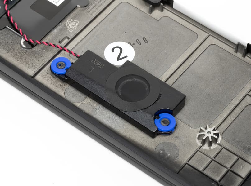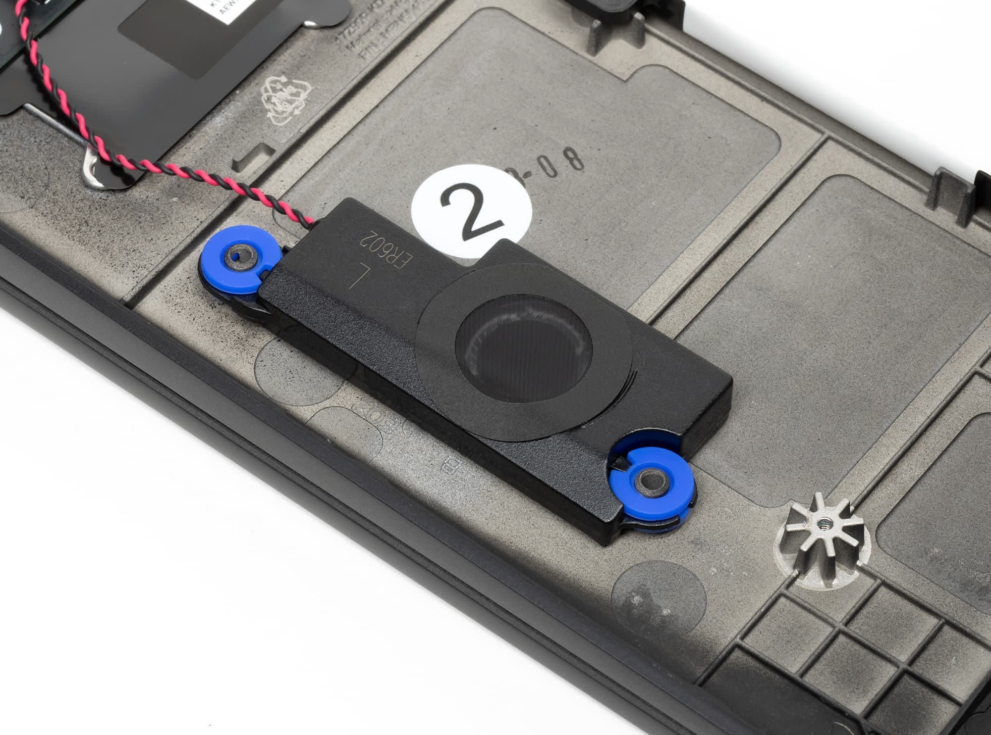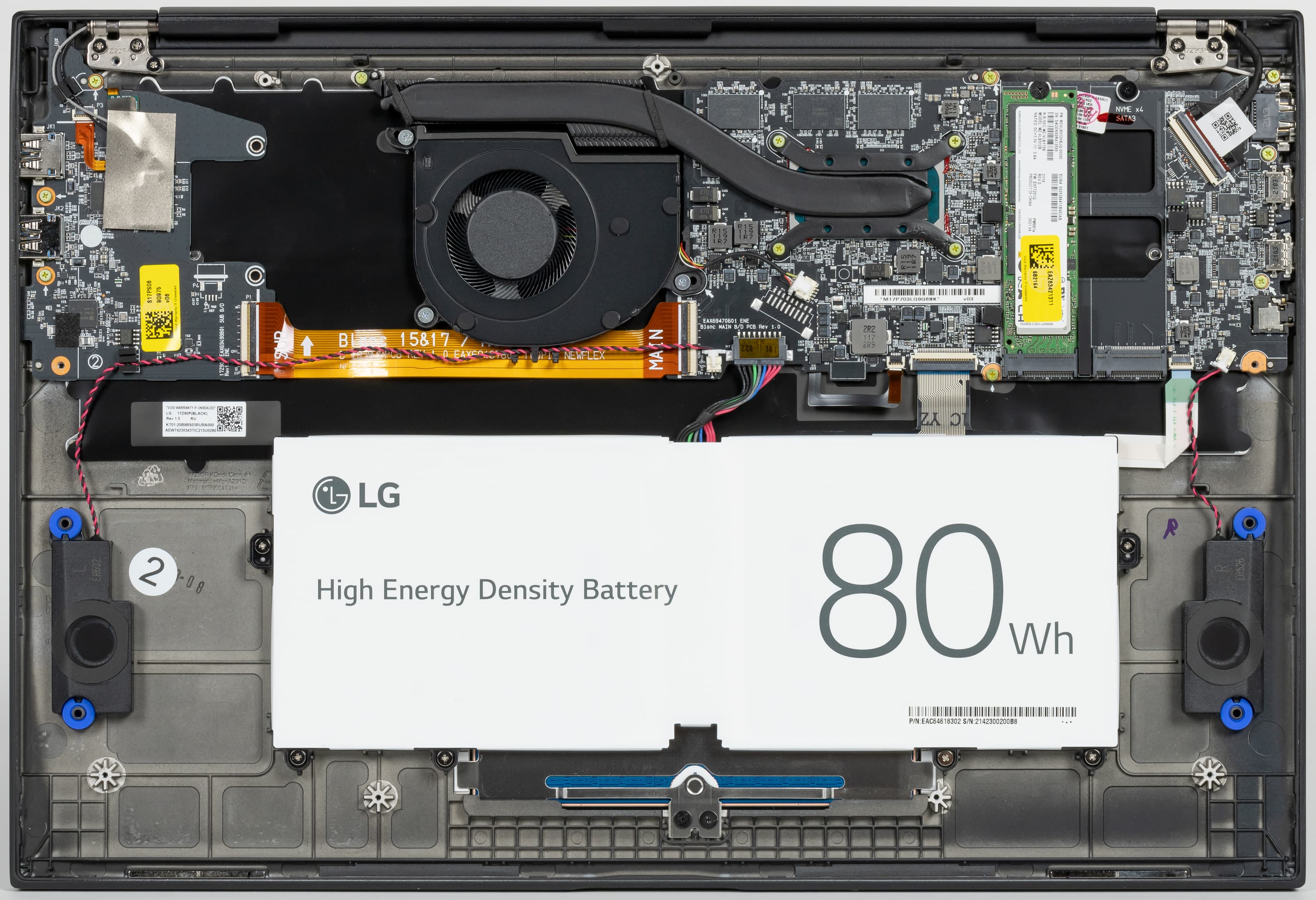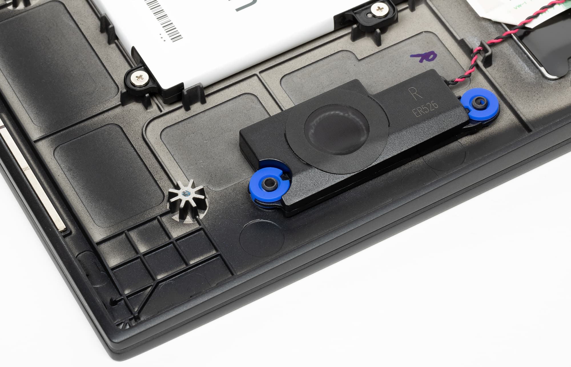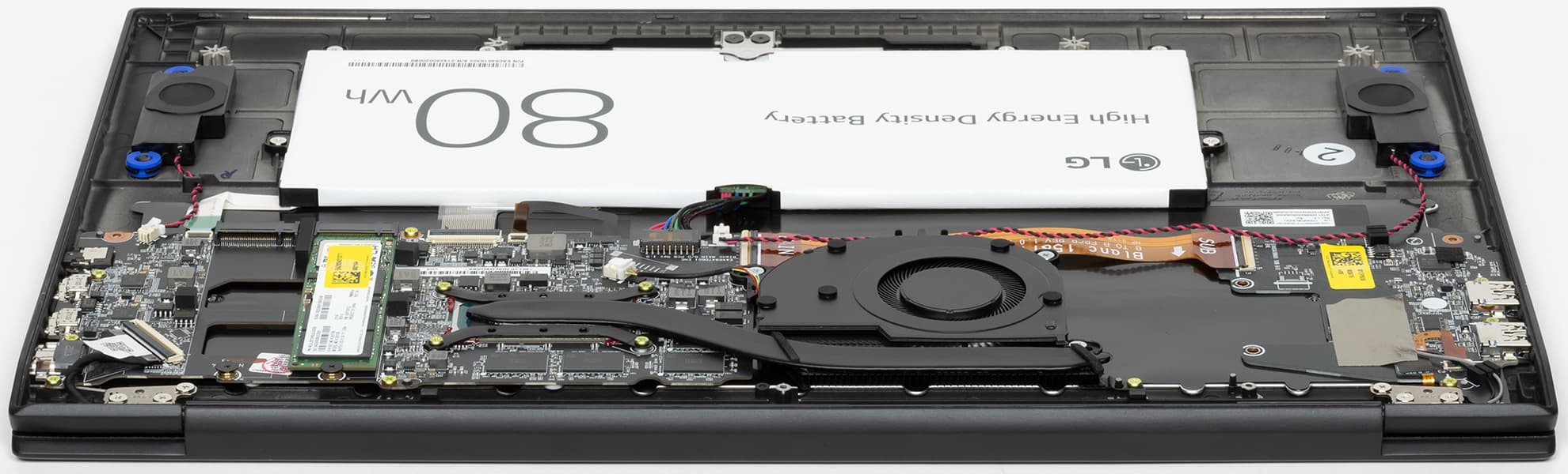 Для снятия нижней крышки корпуса нужно прежде удалить пять круглых липких наклеек и четыре резиновые опоры, а затем отвернуть обнаруженные под ними 9 винтов. Внутри открывается непривычный простор: аппаратные компоненты сосредоточены в верхней части устройства (это менее половины внутреннего объема), а в нижней привольно и вольготно размещаются лишь аккумулятор и два динамика. Можно было бы установить здесь третий, а то и четвертый дополнительные элементы батареи плюс еще один слот M.2 и другие дополнения, но производитель решил следовать названию серии. Раз нам дорог каждый gram — обойдемся без излишеств.