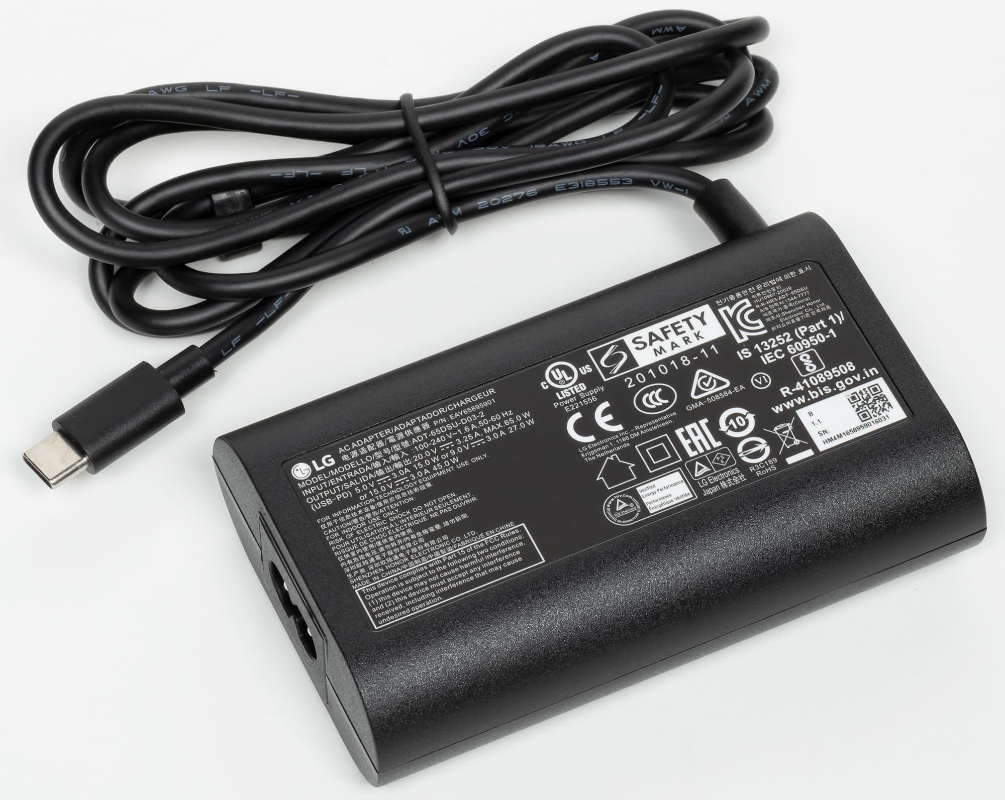 Помимо самого ультрабука в комплекте поставляется довольно легкий адаптер питания (240 г, с кабелем — 295 г), который подходит для работы от сети переменного тока 50—60 Гц при напряжении 100—240 В и обеспечивает на выходе 20 В при силе тока 3,25 А (мощность 65 Вт).
